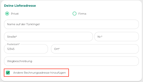 - Hier kann gewählt werden, ob es sich um eine private oder eine Firmenrechnungsadresse handelt.