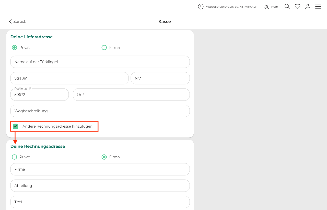 Webshop und in der App kann eine separate Rechnungsadresse bei