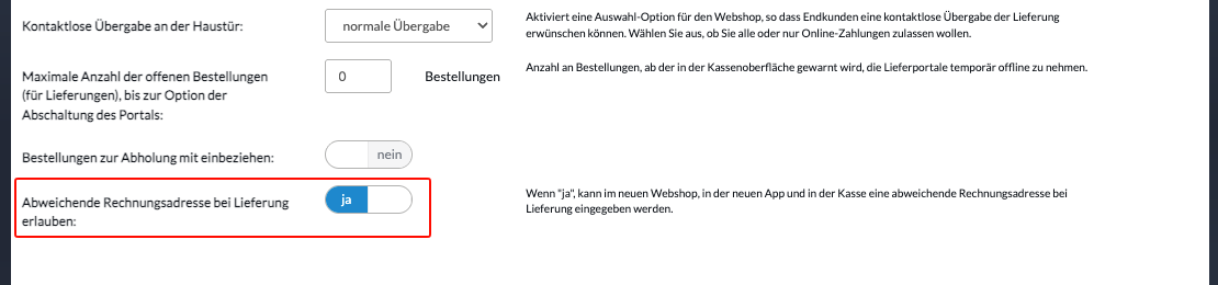 Mit der Einstellung "Abweichende Rechnungsadresse bei Lieferung erlauben" können deine Kunden im Webshop und in der App eine separate Rechnungsadresse angeben, die von der Lieferadresse abweicht.