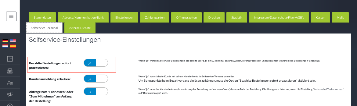 Im Administrationsbereich kann die sofortige Verarbeitung von bezahlten Self-Ordering-Terminal-Bestellungen aktiviert werden.