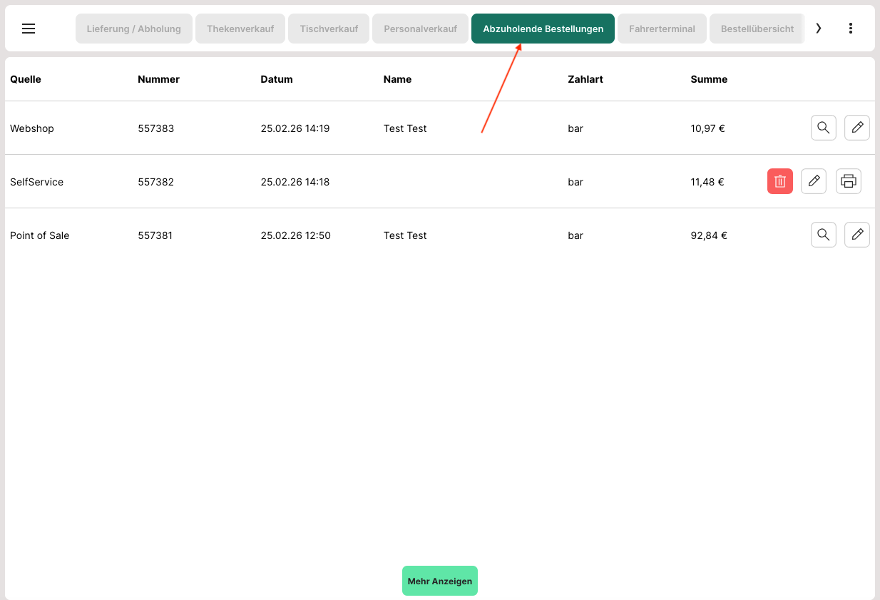 - Gehe in der Kasse zu dem Bereich "Abzuholende Bestellungen"