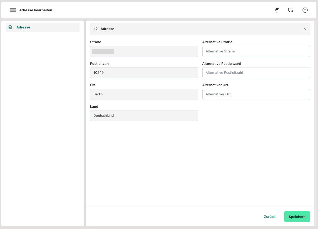 Um eine einzelne neue Adresse hinzuzufügen, klickt man auf den dunkelgrünen Button „ADRESSE HINZUFÜGEN“ oben links. In der Ansicht kann man dann den Straßennamen ("STRASSE"), die Postleitzahl ("PLZ") und die Stadt ("ORT") eintragen und speichern. Optional sind zusätzlich auch noch ein "ALTERNATIVER NAME" und ein "ALTERNATIVER ORT" angebbar.