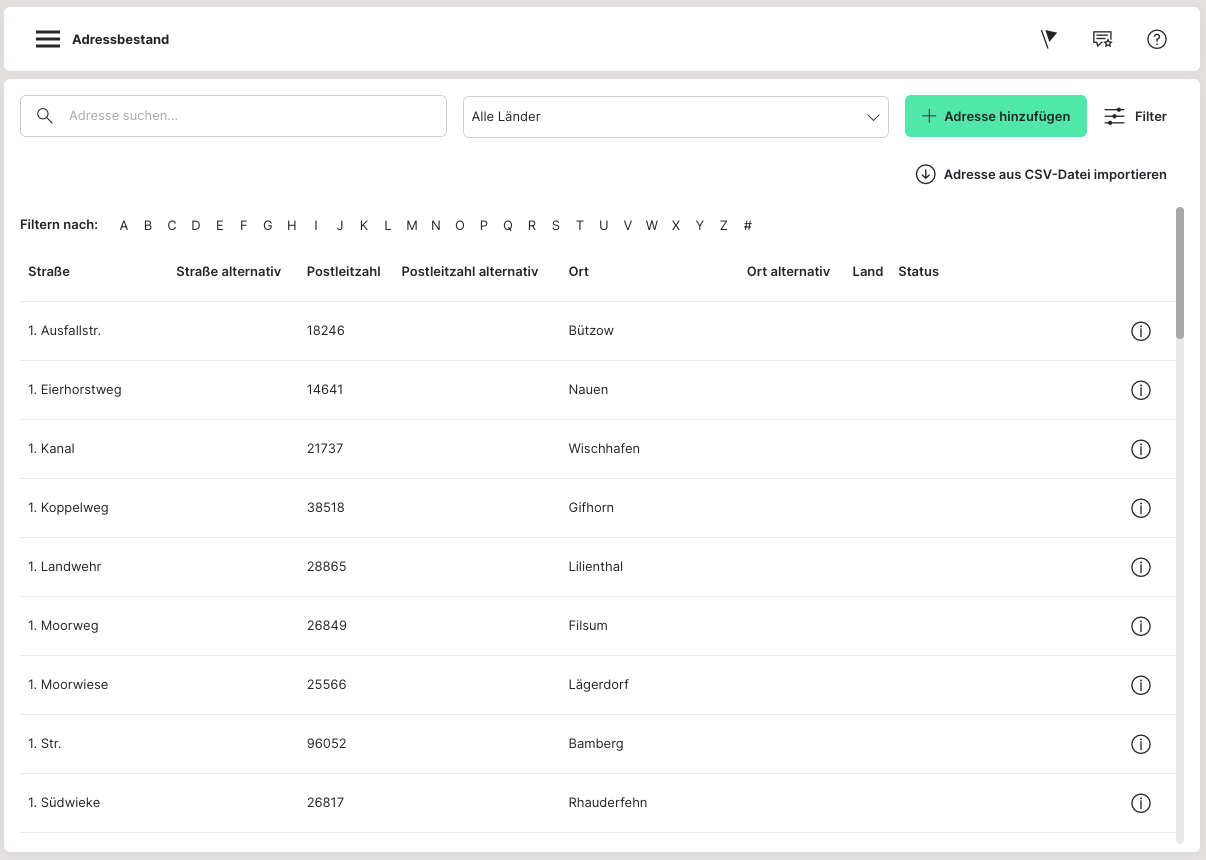 Durch den Klick auf "STRASSENNAME", "STRASSENNAME ALT.", "POSTLEITZAHL", "POSTLEITZAHL ALT.", "ORT" und "ORT ALT." sind entsprechende Sortierungen aktivierbar. "LAND" und das "Tastatur-Symbol" hier wie auch die "'i'-Symbole" rechts bei jedem Listeneintrag haben keine Funktion.