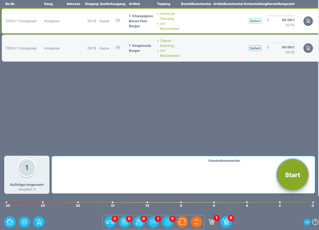 Haben die Artikel die 1. Station durchlaufen und sind fertiggestellt, landet die Bestellung je nach definiertem Ablauf in der nächsten Station (dieser Ablauf wird in der Admin definiert unter Admin > Küchenmanager > Arbeitsablauf). Auf der nächsten Station kann dann wieder über den Start-/Fertig-Button die Produktion fortgeführt werden.
