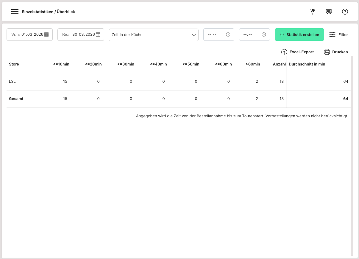 Statistik Zeit in der Küche (Admin > Statistik > Einzelstatistiken/Überblick):