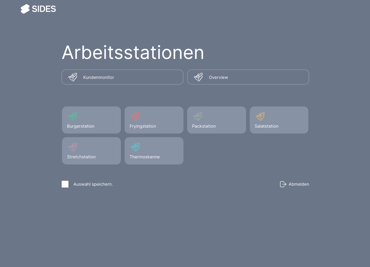 Hier kann eine Arbeitsstation ausgewählt und sich vom Küchenmanager abgemeldet werden.
