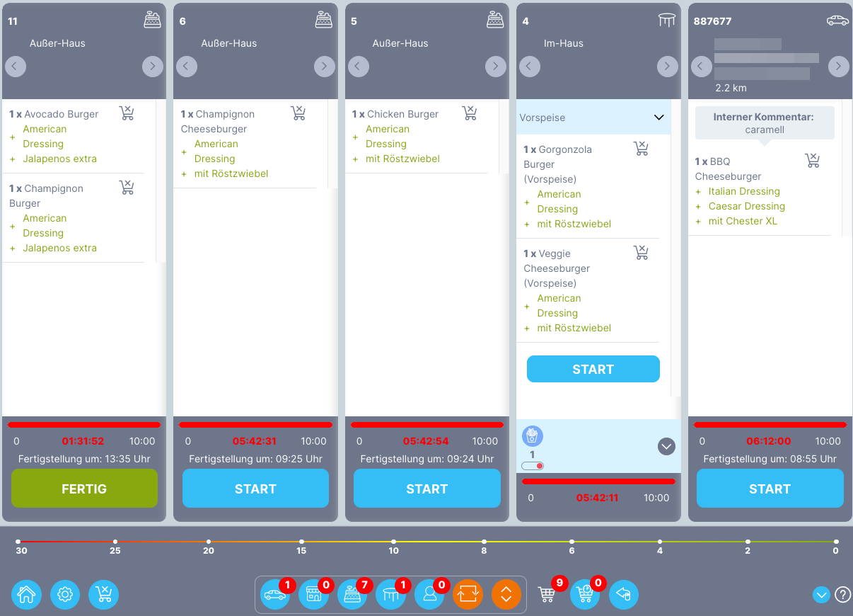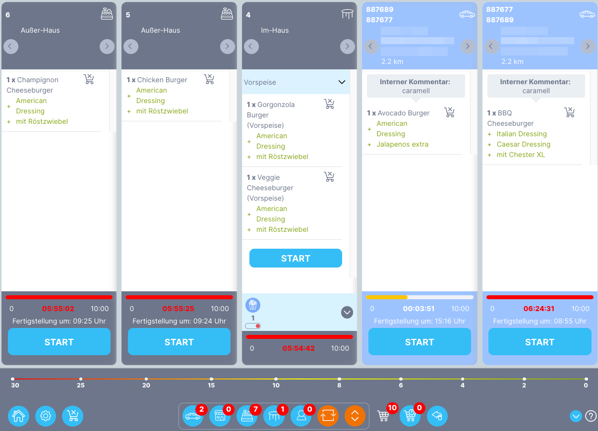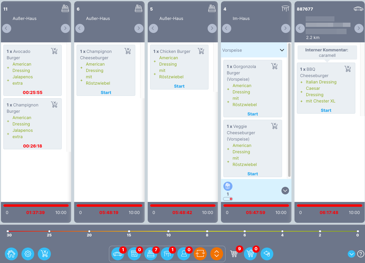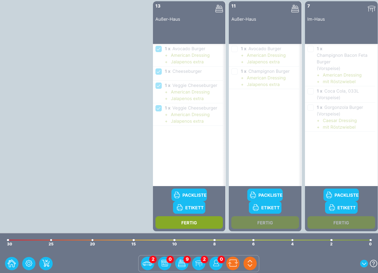 Gesamtansicht (Overview) - in der Gesamtansicht sind alle Bestellungen und deren Status zu sehen. Ein Klick oben rechts in der Bestellung öffnet die Bestellnummer mit den zugehörigen Artikeln. Durch einen Klick auf das Arbeitsstationssymbol öffnet sich ein Fenster, das anzeigt, welche Artikel auf welcher Arbeitsstation zubereitet werden.