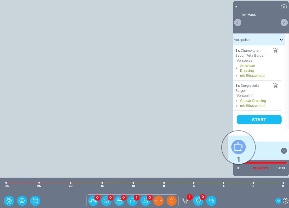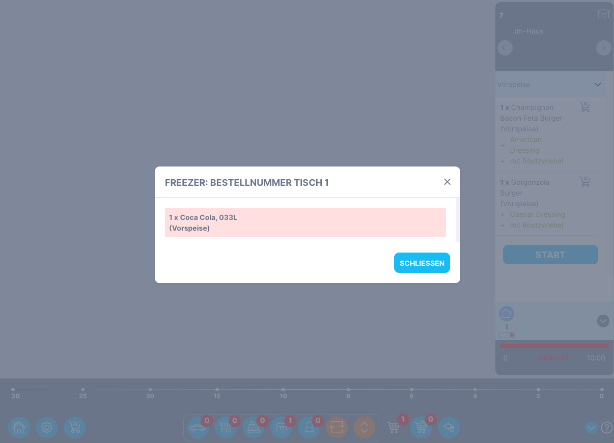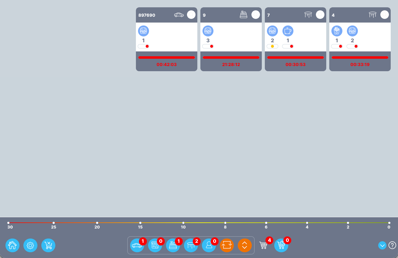 Gesamtansicht (Overview) - in der Gesamtansicht sind alle Bestellungen und deren Status zu sehen. Ein Klick oben rechts in der Bestellung öffnet die Bestellnummer mit den zugehörigen Artikeln. Durch einen Klick auf das Arbeitsstationssymbol öffnet sich ein Fenster, das anzeigt, welche Artikel auf welcher Arbeitsstation zubereitet werden.