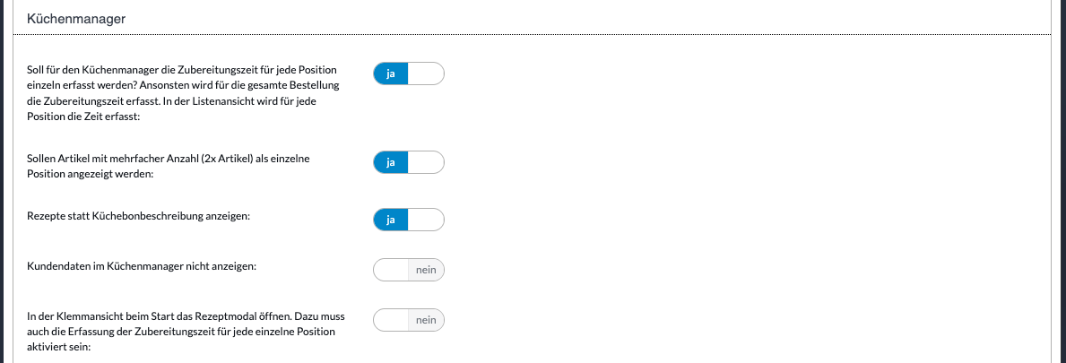 Falls gewünscht kann die Produktion pro Bestellung gestartet werden. Dieses kann eingestellt werden in Admin > Store > Storeübergreifende Einstellungen > Sonstige Einstellungen > unter Küchenmanager > Soll für den Küchenmanager die Zubereitungszeit für jede Position einzeln erfasst werden? Ja/Nein. Ansonsten wird für die gesamte Bestellung die Zubereitungszeit erfasst. In der Listenansicht wird für jede Position die Zeit erfasst.