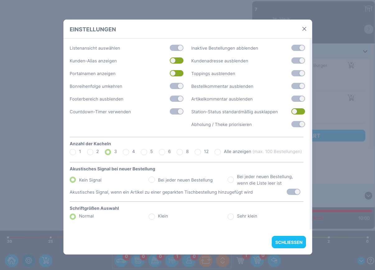 Die Reihenfolge kann nur in der Kachelansicht umgekehrt werden. Dann werden die Bestellungen von links nach rechts angezeigt oder umgekehrt. Der neue Auftrag wird entsprechend der Einstellung der Auftragsreihenfolge auf der linken oder rechten Seite der Liste hinzugefügt.