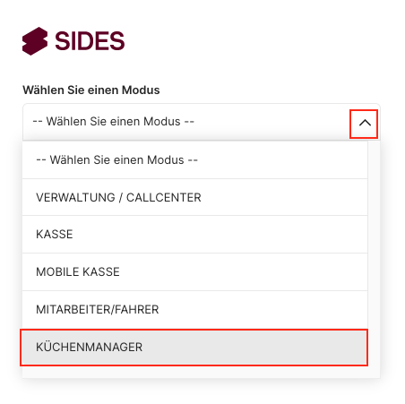 Wähle im nächsten Schritt eine der angelegten Arbeitsstationen aus (diese werden in der Admin konfiguriert unter Admin > Küchenmanager > Arbeitsstation).