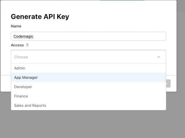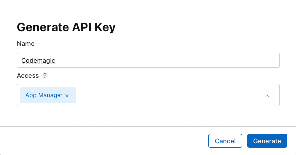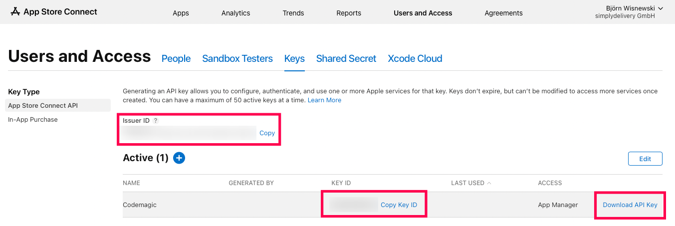 Erstelle einen neuen Schlüssel mit dem Namen "Codemagic SIDES" und dem Zugriffsrecht "App-Manager".