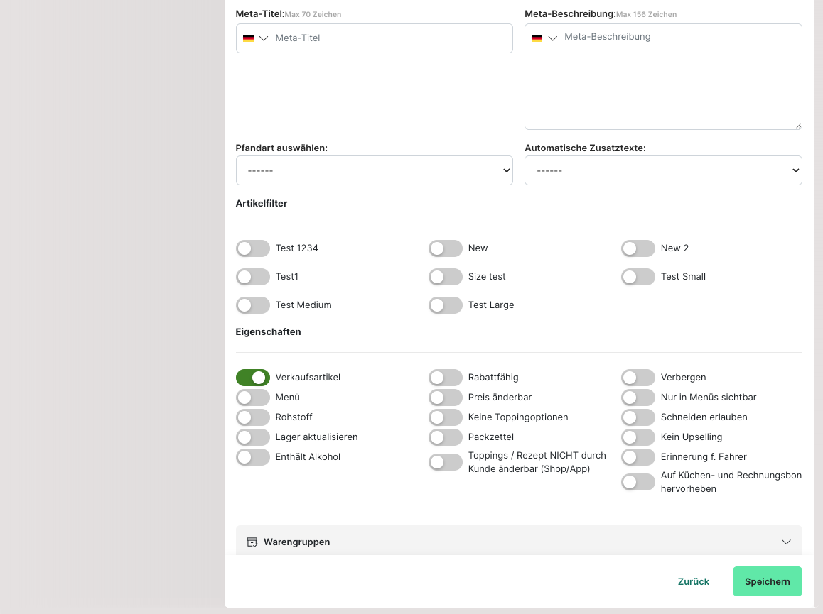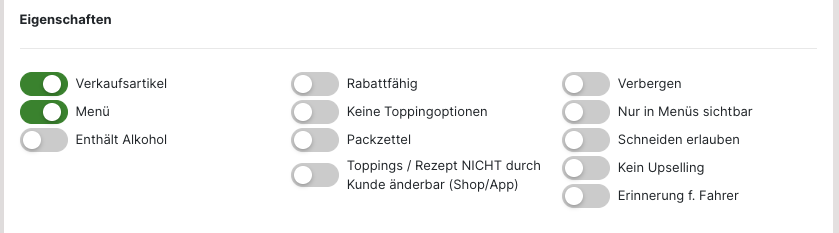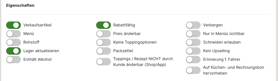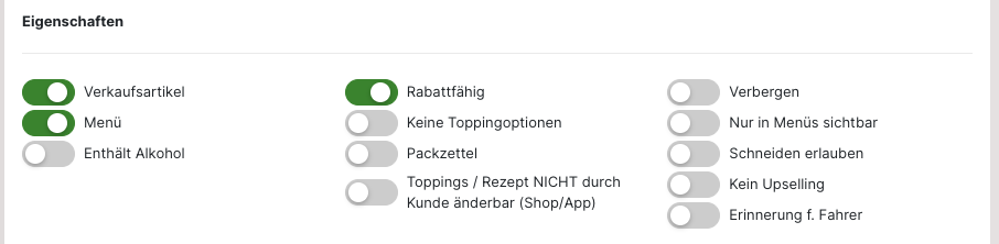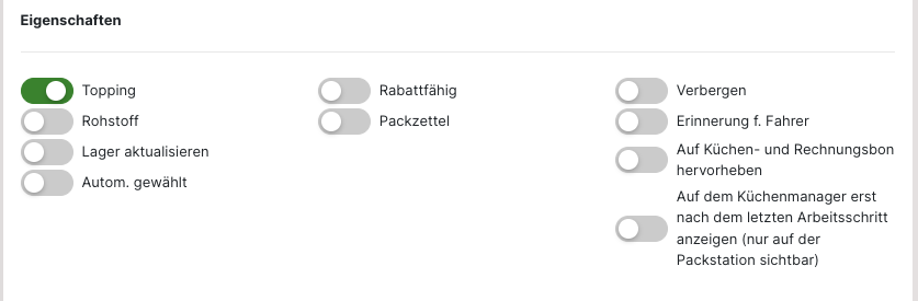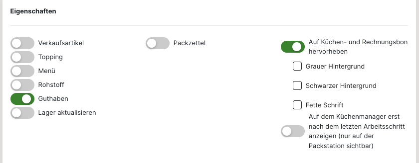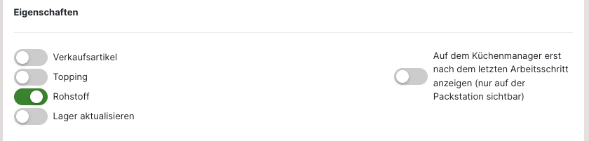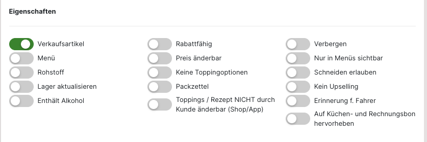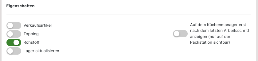 Soll ein "Topping", "Rohstoff" oder "Guthaben" anlegt werden, muss die Auswahl für den "Verkaufsartikel" bei den "Eigenschaften" entfernt werden. Anschließend werden die weiteren Optionen angezeigt. Ebenso variieren auch die weiteren Einstellungen je nach gewähltem Artikel.