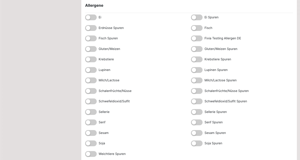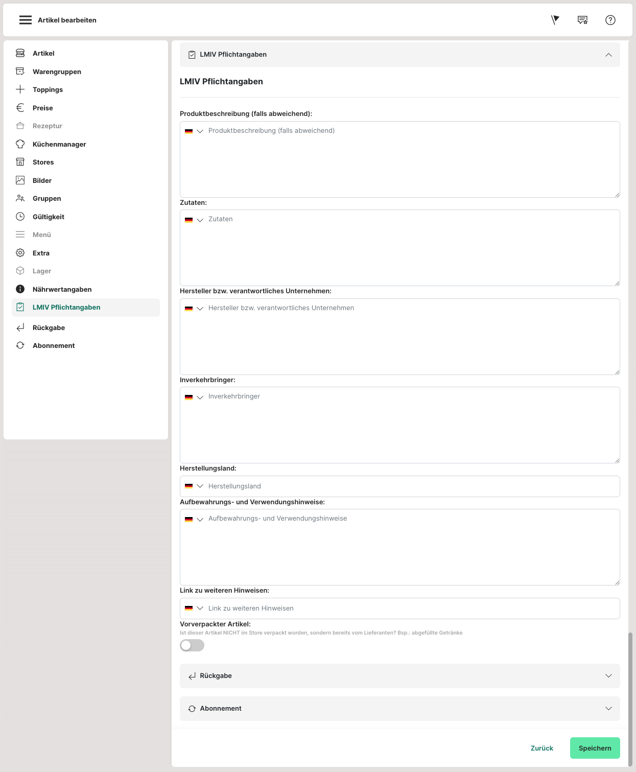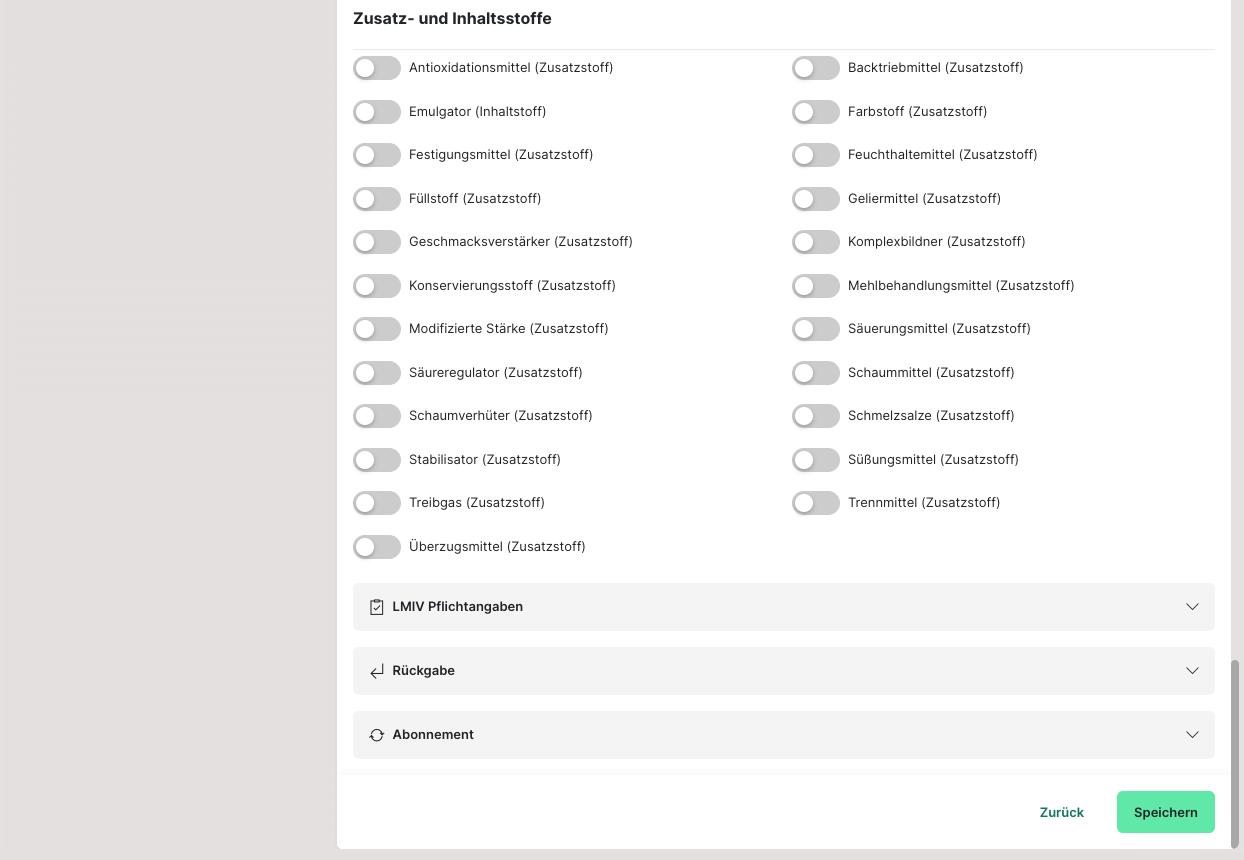Die LMIV-Angaben (Lebensmittel-Informationsverordnung) sind seit 2014 verpflichtend und können an dieser Stelle eingepflegt werden.