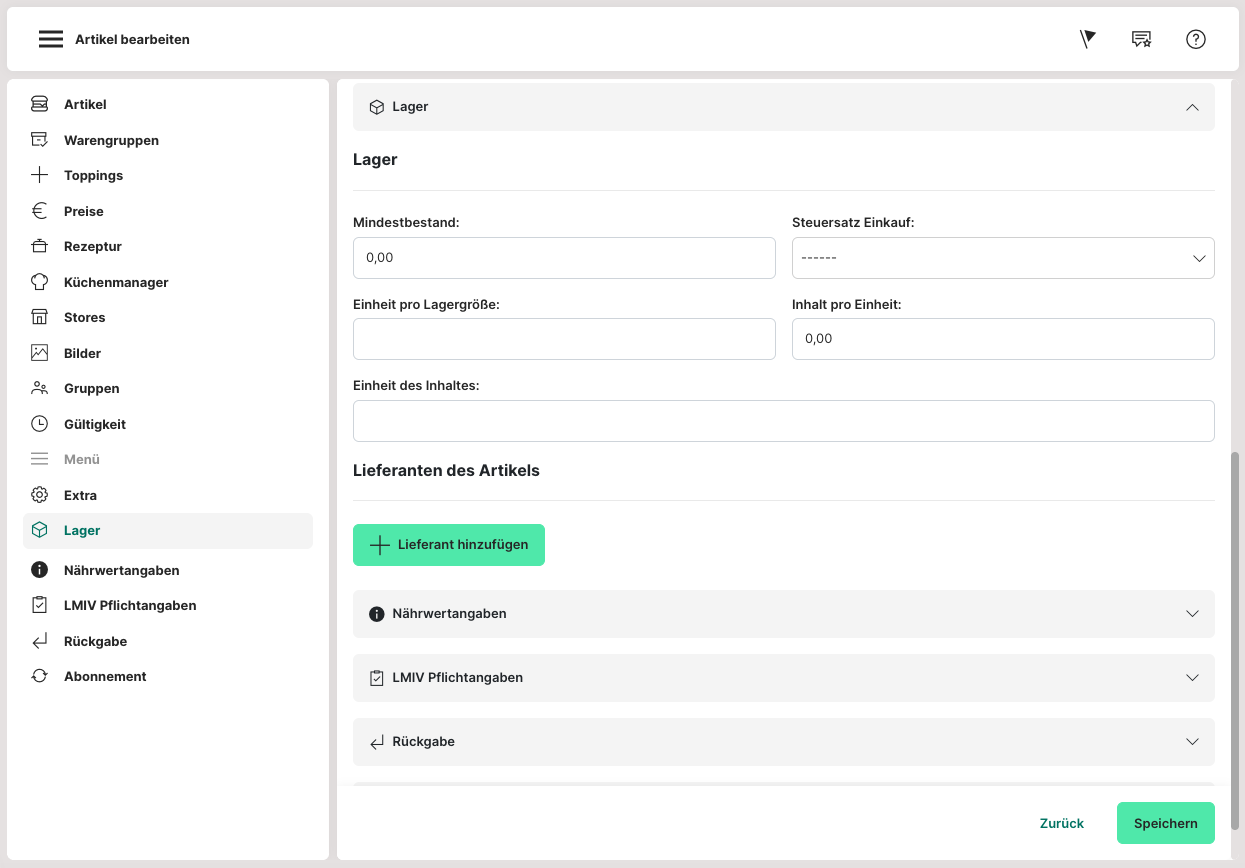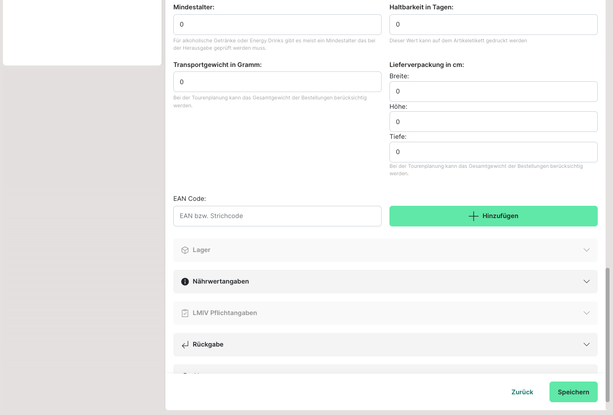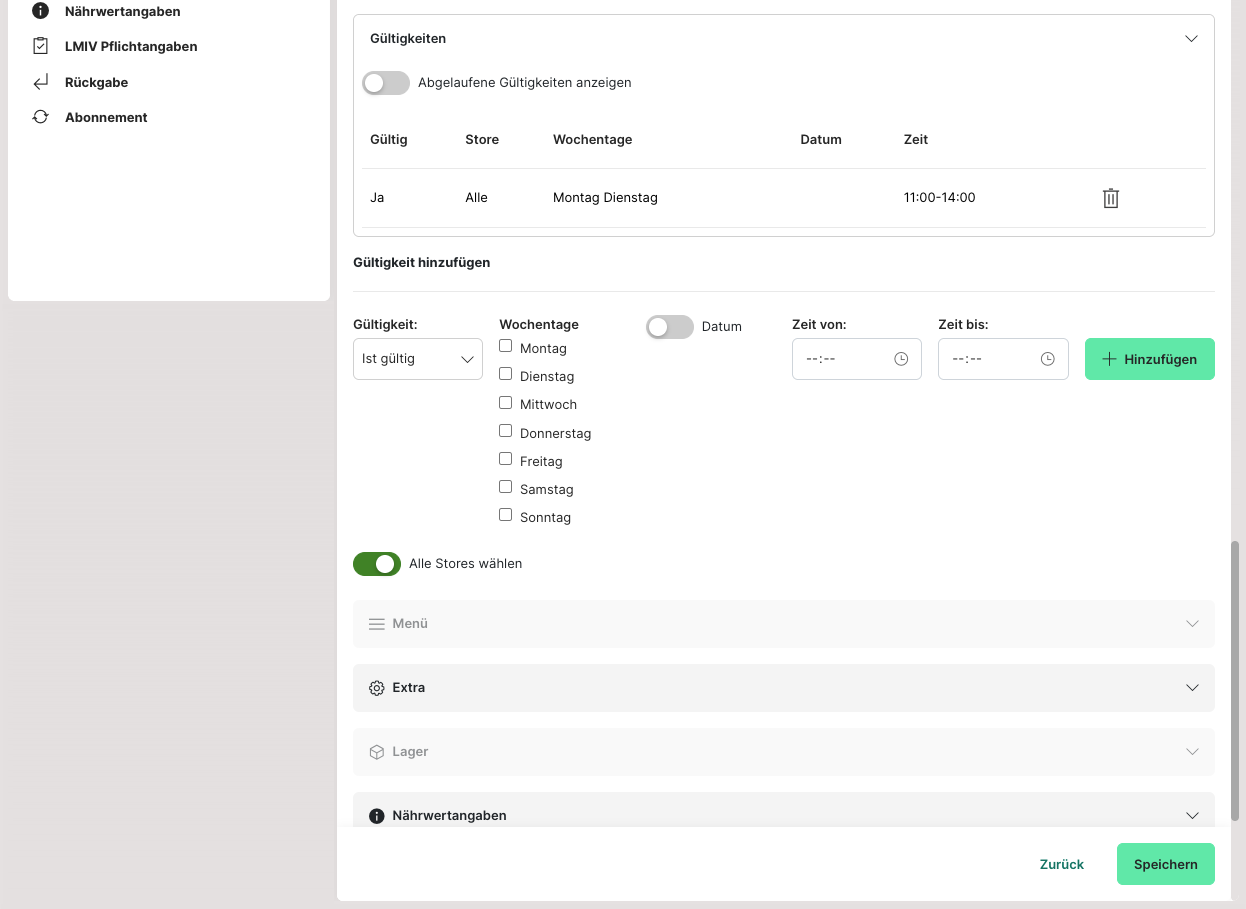 Die LMIV-Angaben (Lebensmittel-Informationsverordnung) sind seit 2014 verpflichtend und können an dieser Stelle eingepflegt werden.