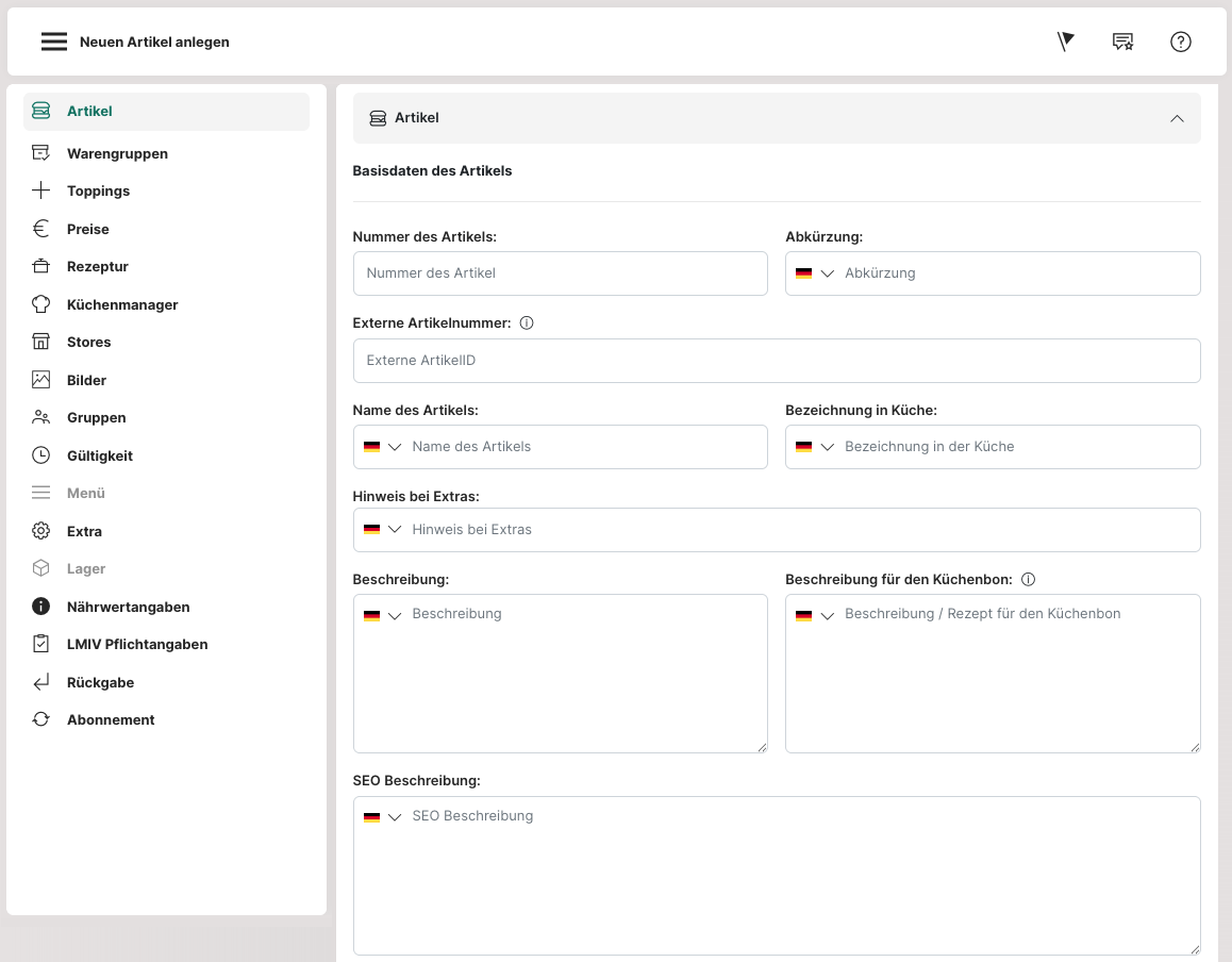 Mit den Artikeln können die Produkte erstellt und bearbeitet werden, wie Verkaufsartikel, Topping, Menü, Rohstoff, Guthaben oder Verpackungen, sowie spezifische Details zu jedem einzelnen Produkt hinterlegt werden.