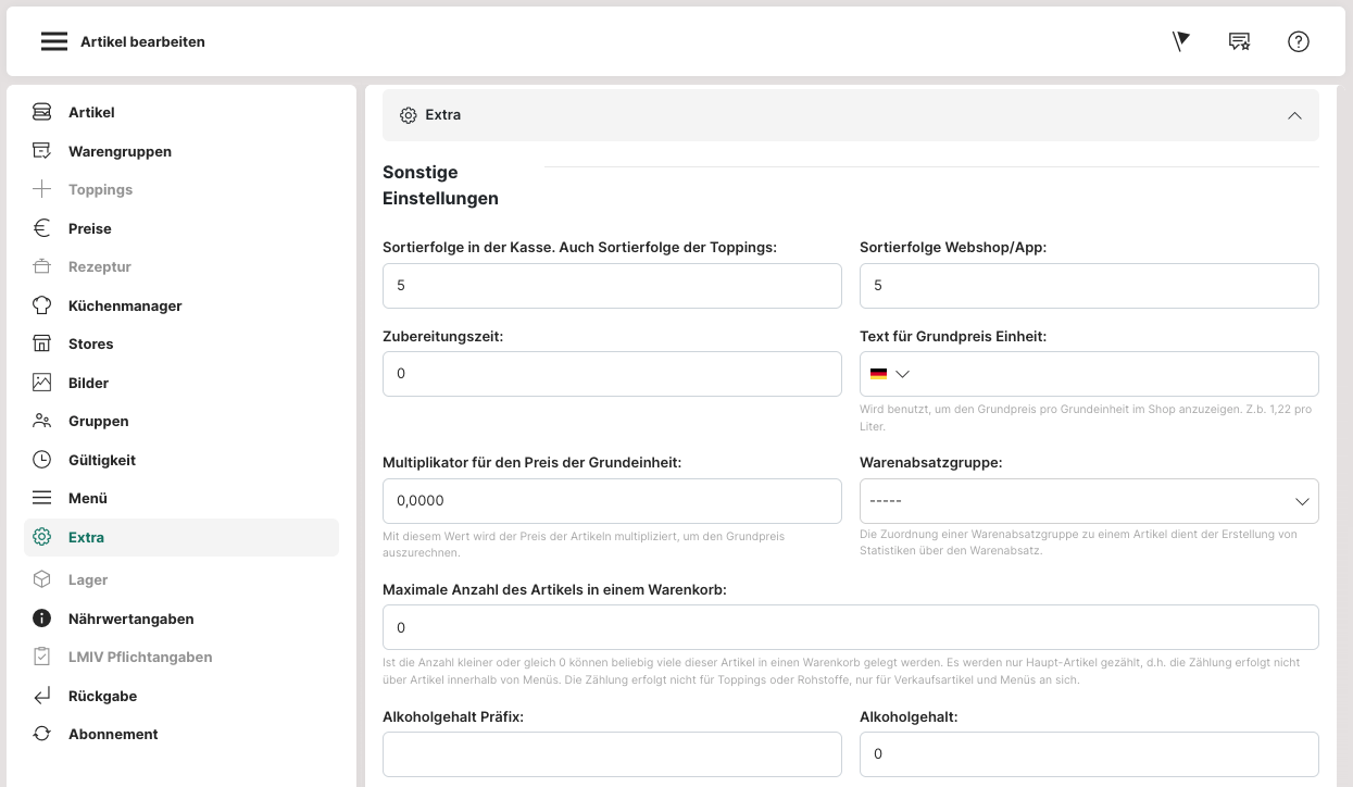 Im Reiter "Extra" können weitere Einstellungen getroffen werden. So können zum Beispiel, wenn eine alphabetische Sortierreihenfolge nicht genügt, für Kasse und Webshop/App eine andere Sortierreihenfolge festgelegt werden. Hierzu wird einfach mit der Zahl 1 begonnen und dann der nächste Artikel mit der Zahl 2 fortgeführt.