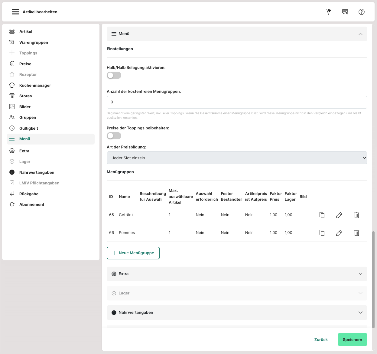 Ein Menü kann beispielsweise aus 2 Slots bestehen, d.h. einer Pizza und einem Getränk. Es können mehrere Menügruppen angelegt werden.