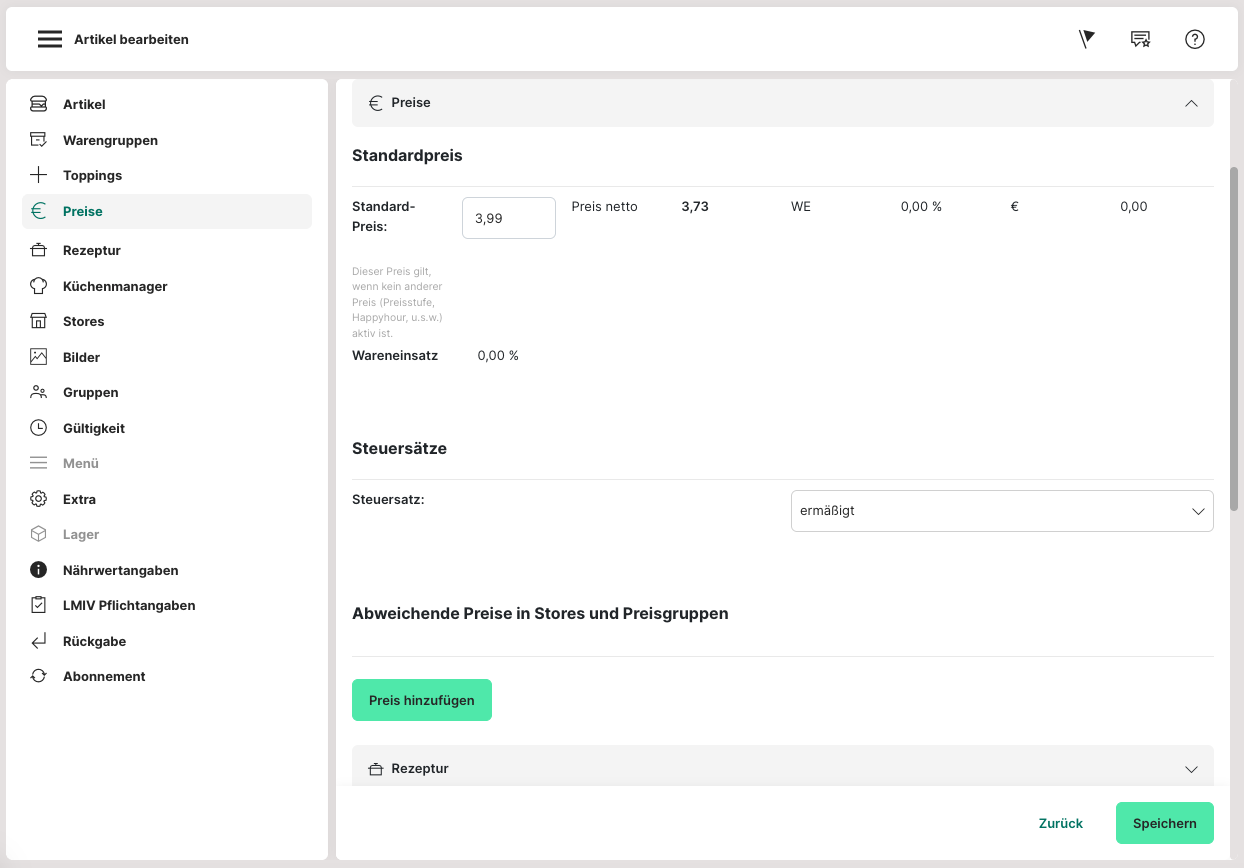Wurde beispielsweise ein Getränk angelegt, bei dem einen Grundpreis angeben werden muss, sind die beiden nächsten Felder relevant.
