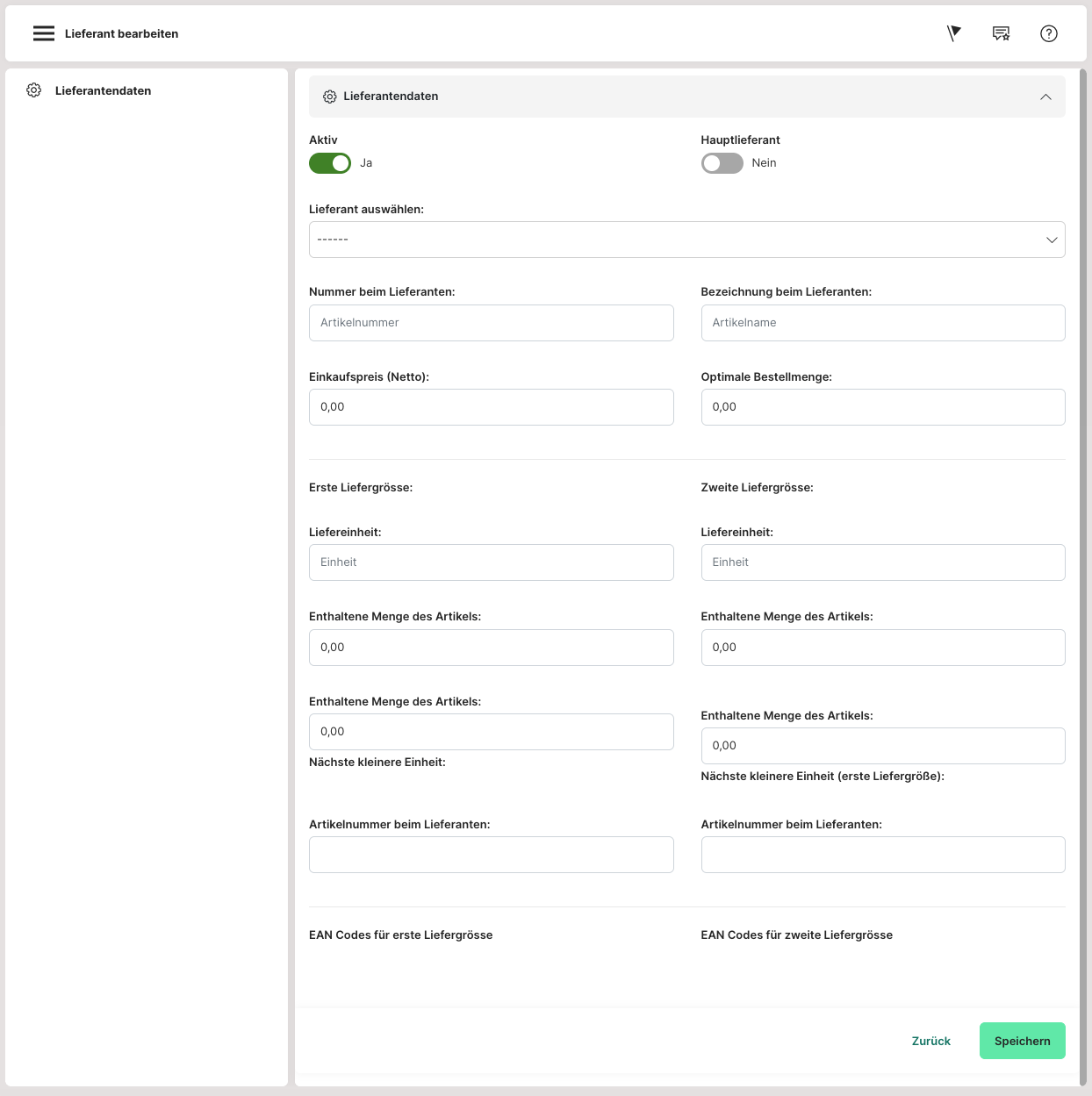 Im Anschluss kann ein entsprechender "Lieferant" mit dem Button "Lieferant hinzufügen" hinzugefügt werden. Dort werden die entsprechenden Liefergrößen hinterlegt.