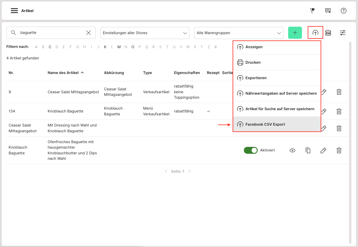 Auf der Hauptseite von den Artikeln (Admin: Artikel > Artikel) kann über den Download-Button ein "Facebook-CSV-Export" heruntergeladen werden.