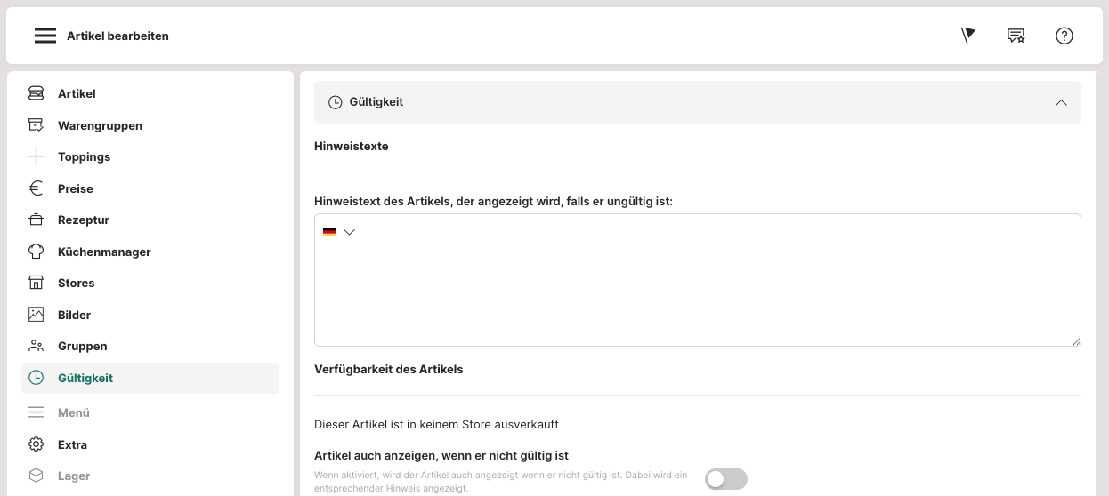 Gültigkeit für den Artikel einstellen