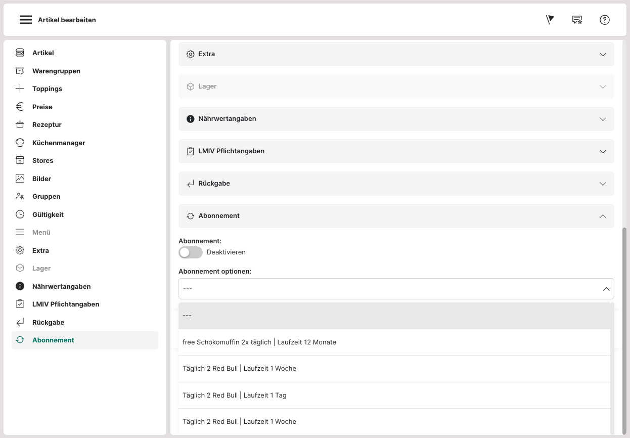 Mit "Abonnement" kann ein Abo erstellt werden, das Kunden im Webshop (z. B. monatlich oder jährlich) erwerben und anschließend im Webshop, am Self-Ordering-Terminal (SOT) oder an der Kasse (POS) einlösen können.