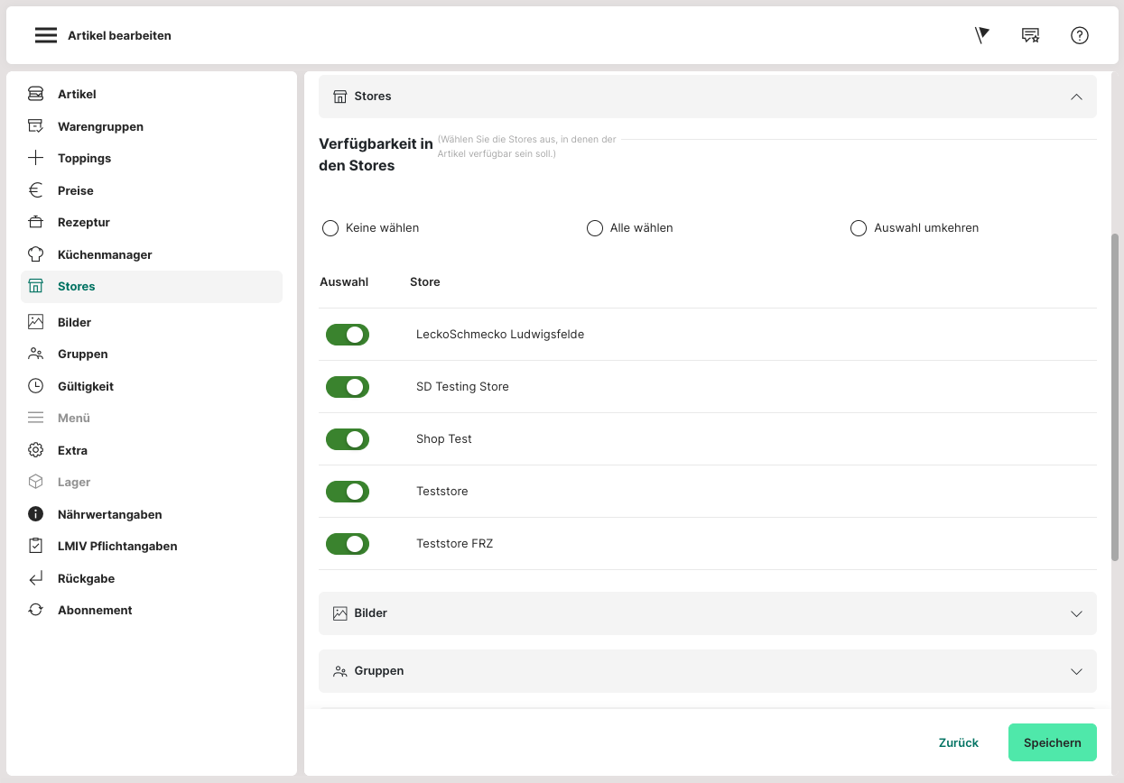 Wenn mehrere Stores verwaltet werden und der Artikel für alle Stores gültig ist, dann können die Einstellungen vereinfacht übernommen werden, indem auf den grünen Button "alle wählen" geklickt wird. Ebenso können alle Stores mit einem Klick abgewählt oder die bisher getroffene Auswahl umgekehrt werden.