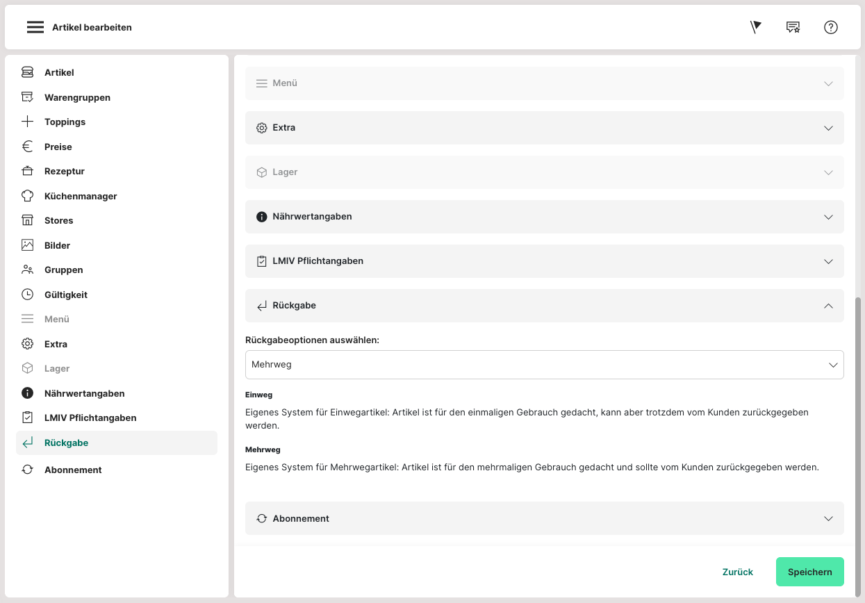 Der Reiter "Rückgabe" wird nur benötigt, wenn ein "Verkaufsartikel" für eine Einweg- oder Mehrwegpackung erstellt wurde z. B. eine Burger Verpackung.