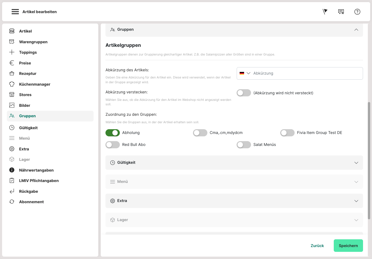 Angelegte "Artikelgruppen" (Admin: Artikel > Artikelgruppen) können hier dem jeweiligen Artikel zugeordnet werden.