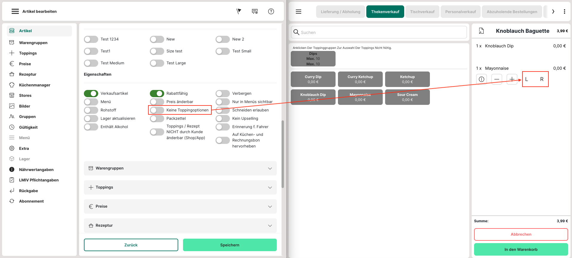 Bearbeiten des Toppings eine Links-/Rechts-Konfiguration mit "L" und "R"