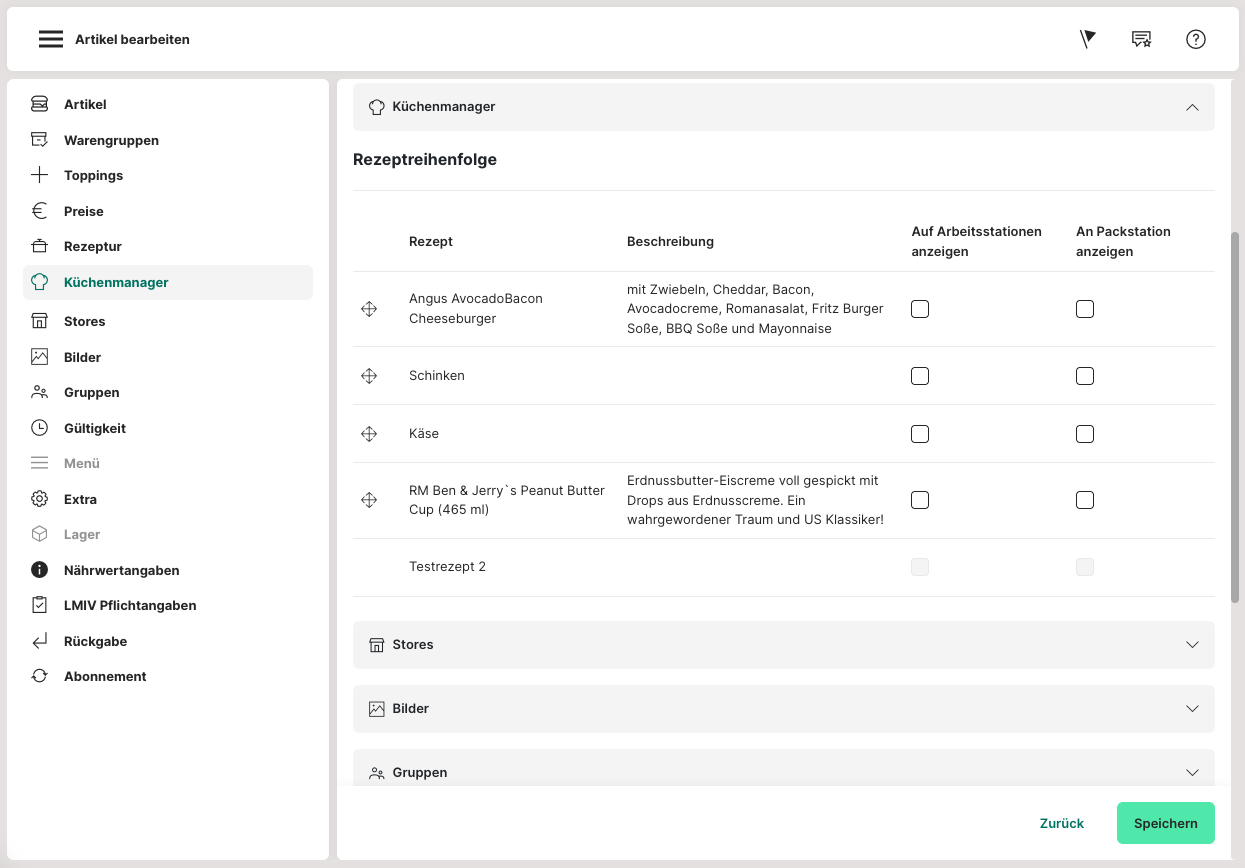 Auf dem Küchenmanager erst nach dem letzten Arbeitsschritt anzeigen (nur auf der Packstation sichtbar): Ist der Küchenmanager aktiv, kann explizit festgelegt, dass dieser Artikel erst nach dem letzten Arbeitsschritt angezeigt wird, also nur auf der Packstation sichtbar ist.