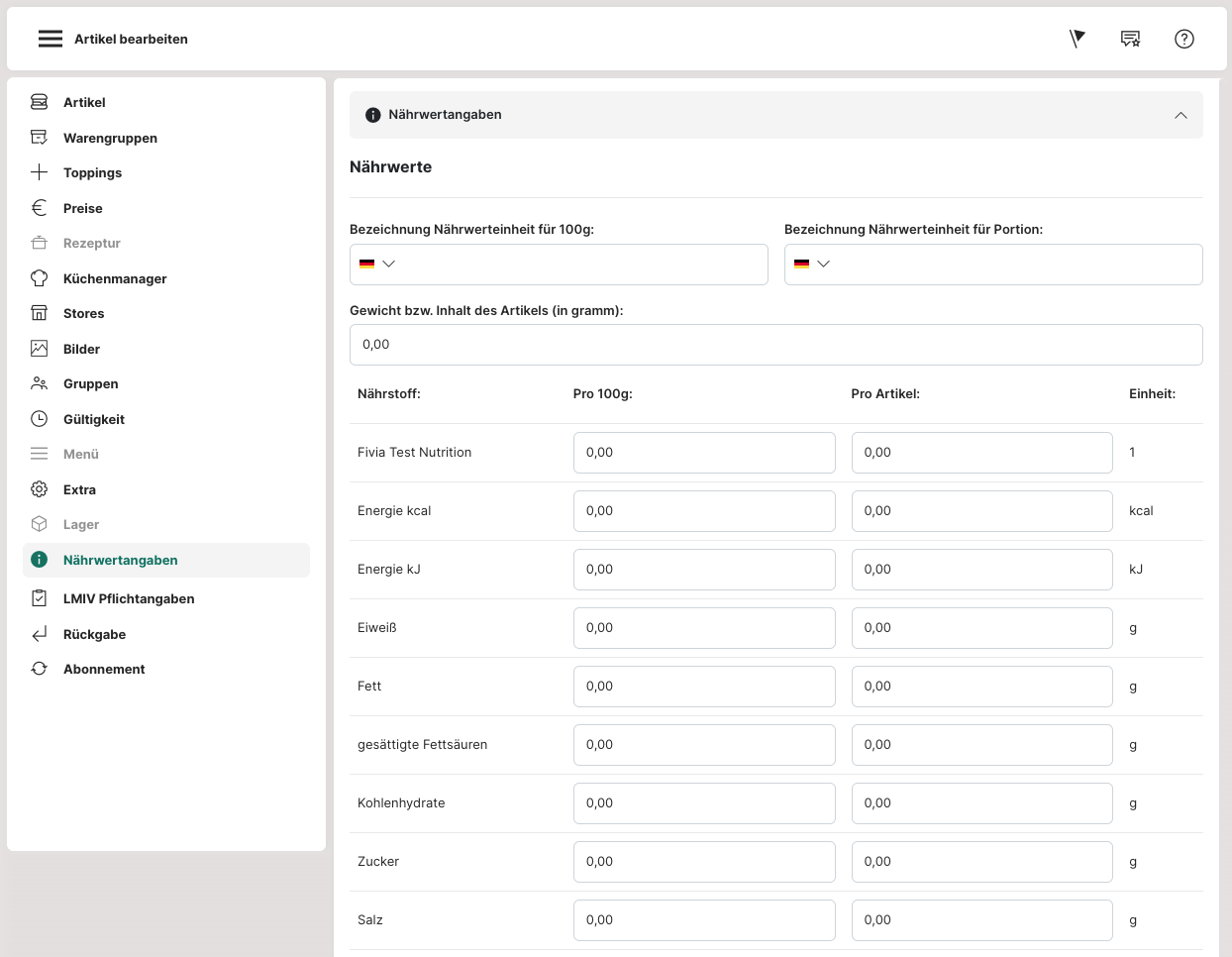 Damit "Bezeichnung Nährwerteinheit für 100g" und "Bezeichung Nährwerteinheit für Portion" erscheinen, muss beim Reiter "Artikel" der Artikel als "Verkaufsartikel" aktiviert sein.