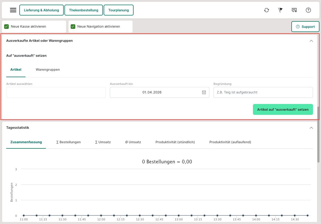 Falls ein oder mehrere Artikel ausverkauft sein sollten, besteht die Möglichkeit, dies in der Admin- und in der POS-Oberfläche unter "Dashboard" (Admin/POS: Dashboard) als ausverkauft zu setzen.