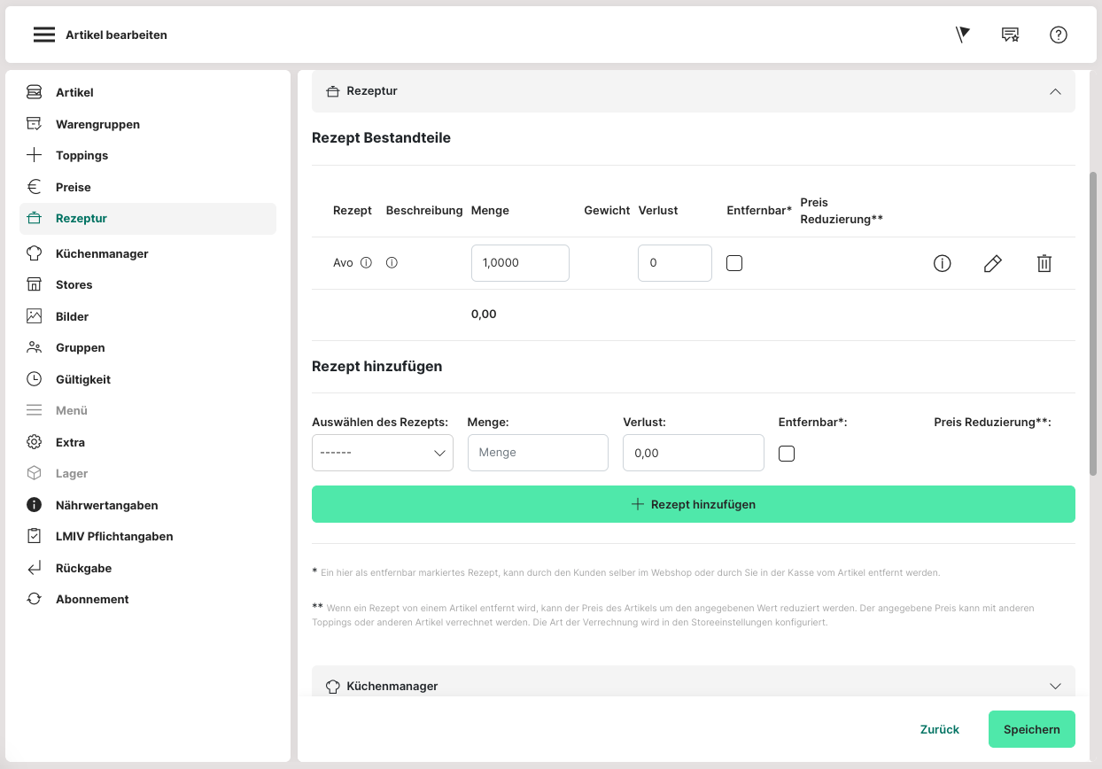 Wenn zuvor eine Rezeptur angelegt wurde, erscheinen die Bestandteile im Abschnitt "Küchenmanager".