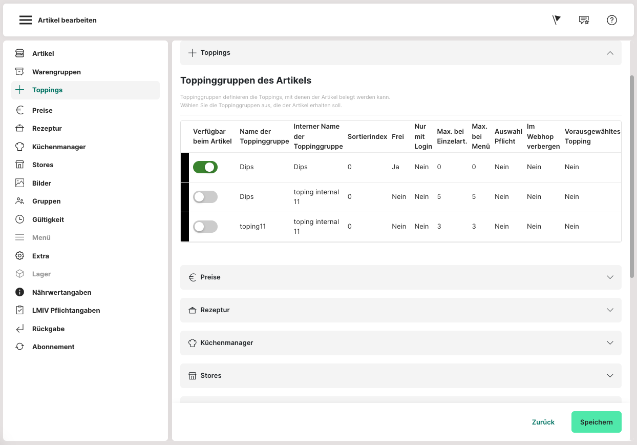 Diese Toppinggruppen können an dieser Stelle dem Artikel zugeordnet werden. Es können auch mehrere Toppinggruppen ausgewählt werden.