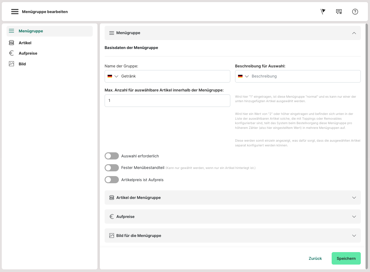 Aufpreis: Soll für die Menügruppe ein regulärer Aufpreis verlangt werden, kann dies hier angegeben werden. Sollte es also beispielsweise in einem Menü möglich sein ein weiteres Getränk für einen geringen Aufpreis dazu zu buchen, ist das hier anzugeben.