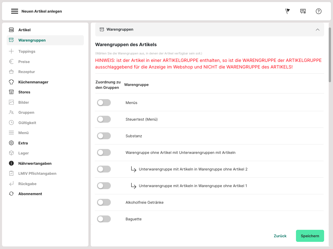 Im Reiter "Warengruppen" sind die bereits angelegten Warengruppen zu finden und können dem jeweiligen Artikel zugewiesen werden.