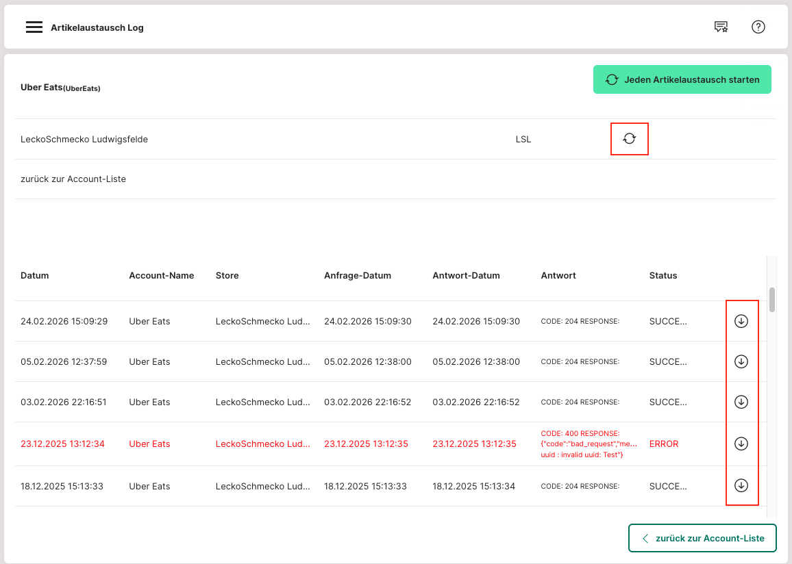 Gegebenenfalls ist es notwendig, im entsprechenden Menü (erneut) die Synchronisierung über den Button "Artikelaustausch starten" oben auszulösen - unten können in den Logs die erfolgreichen und erfolglosen Übertragungen eingesehen und als ".json"-Dateien (lesbar mit einem Editor-Programm auf dem PC) heruntergeladen werden.