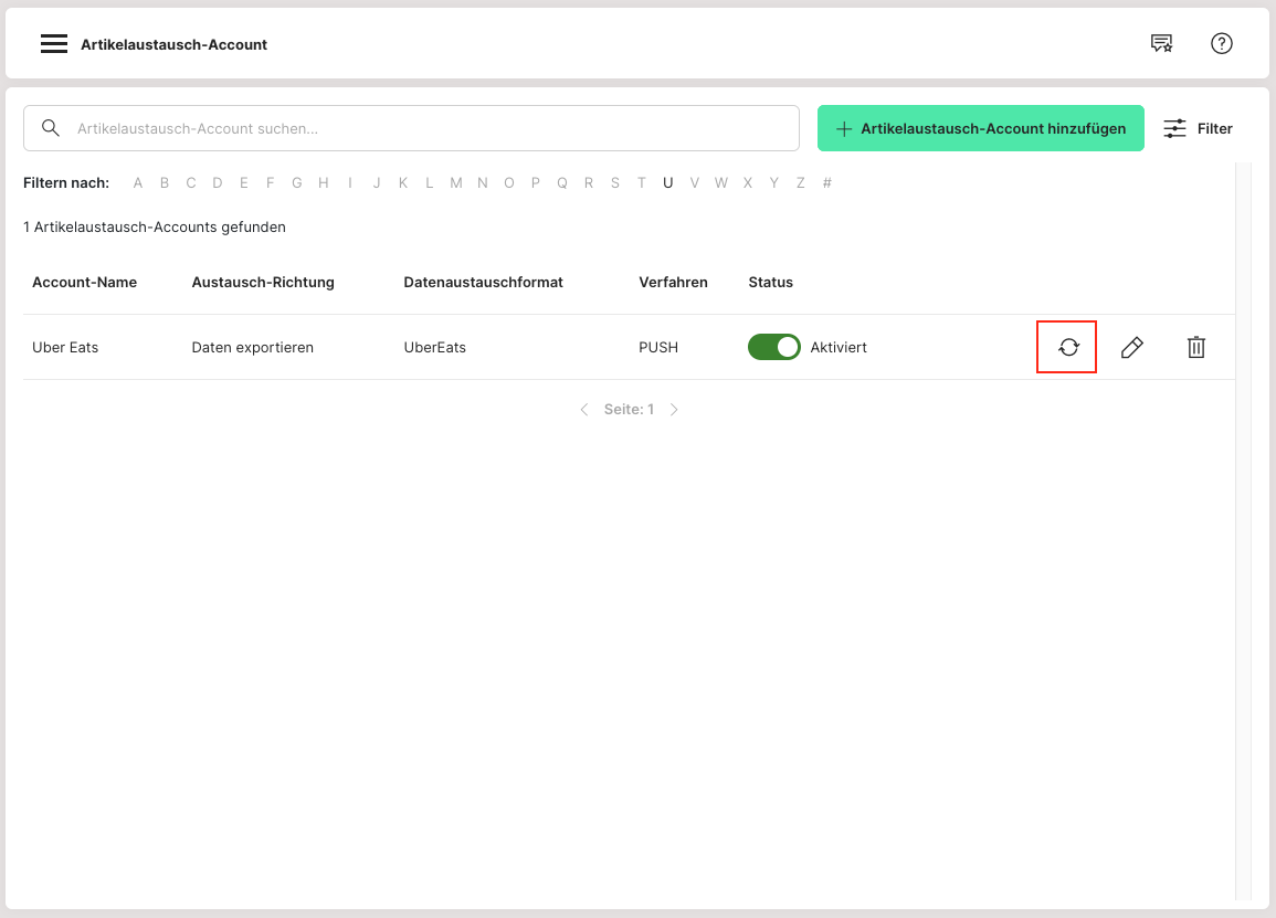 Hier als Beispiel ein angelegter Account für Uber Eats - dabei zu beachten vor allem der Button rechts "Artikel synchronisieren" welcher manuell geklickt werden muss, um die Artikel von unserem System zu Uber Eats zu übertragen.