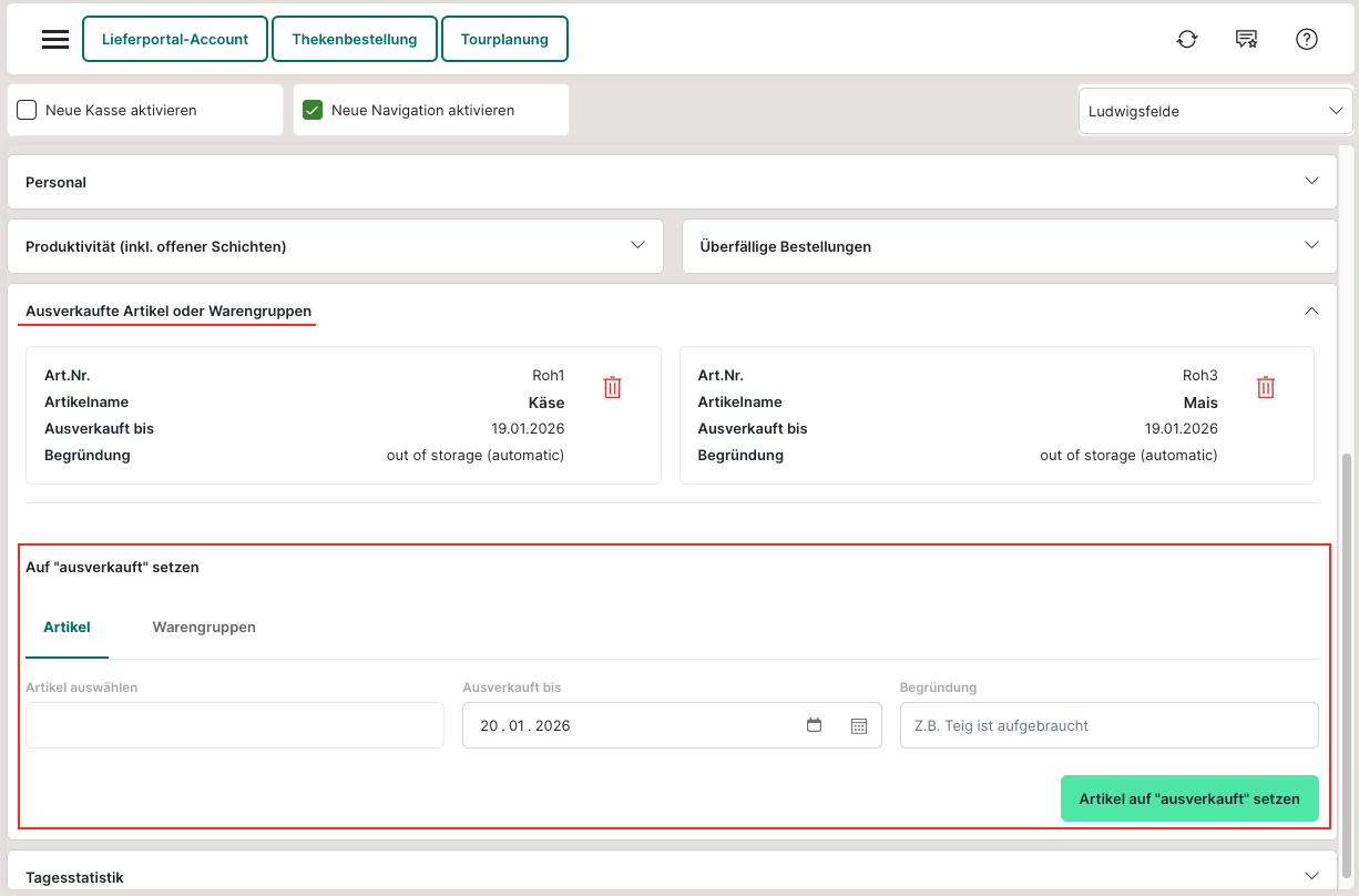 Oberhalb des Eingabebereichs wird eine Übersicht der aktuell als ausverkauft markierten Artikel oder Warengruppen angezeigt. Einzelne Einträge können jederzeit über das Papierkorbsymbol entfernt werden, wodurch der Artikel sofort wieder verfügbar ist.