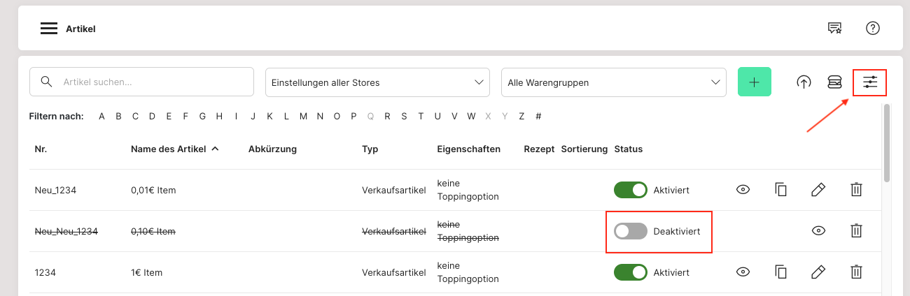 Der ausgeblendete Artikel wird weiterhin unter den inaktiven Artikeln angezeigt. Über die Filtereinstellungen lassen sich alle Artikel, nur aktive oder nur inaktive Artikel anzeigen.