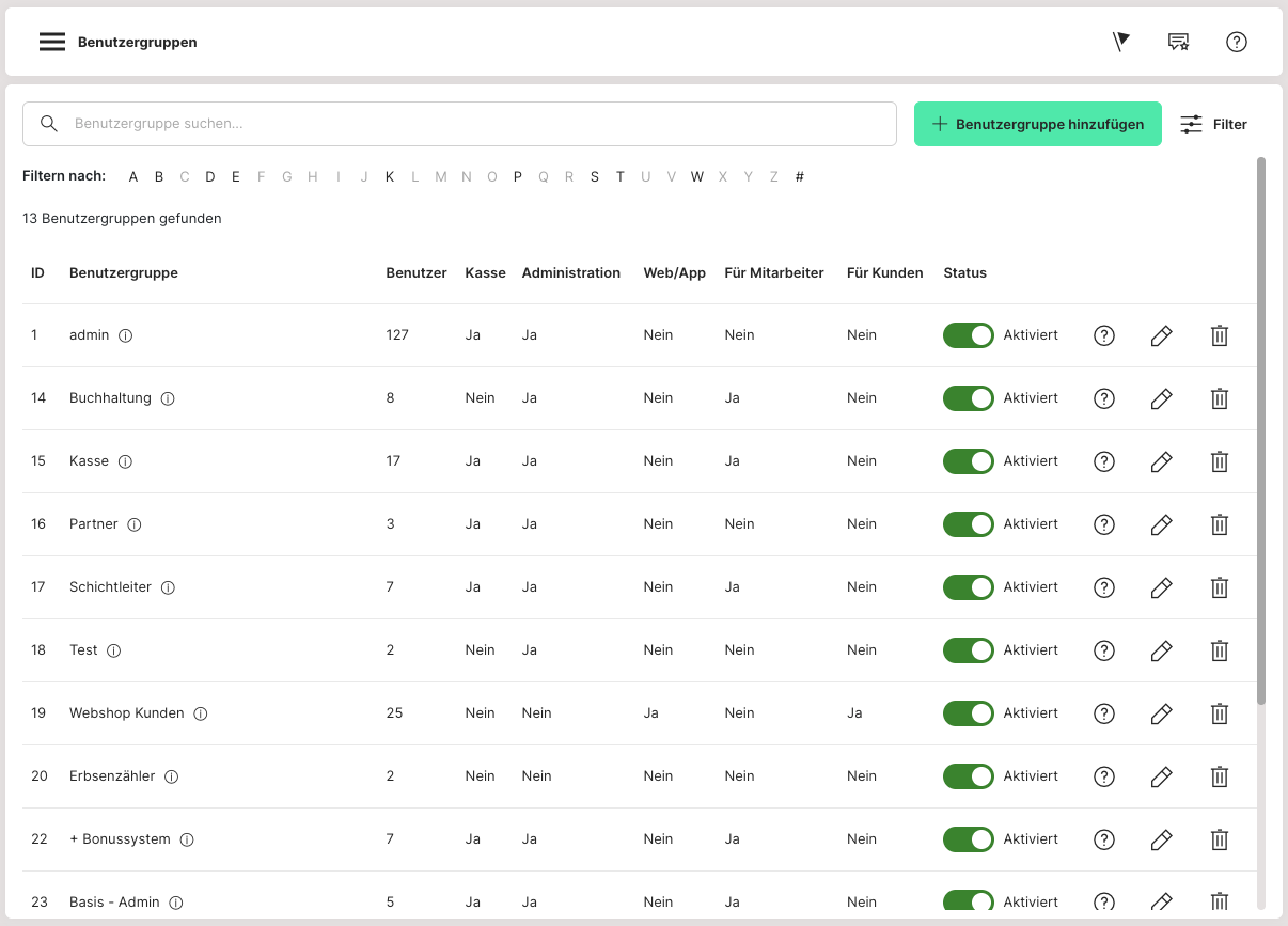 Mit einzelnen Benutzergruppen legst du Zugangsberechtigungen zum System fest. Ein Admin erhält bspw. uneingeschränkten Zugriff auf alle Bereiche. Ein Partner-Account sollte nur Zugriff auf die Einstellungen haben, die für seinen Store relevant sind. Es gibt bereits vordefinierte Benutzergruppen, die von uns entworfen wurden, welche jedoch beliebig verändert werden können. Sollten deine Mitarbeiter bspw. weitere Berechtigungen brauchen, kann die Benutzergruppe für den Kassen-Zugang von uns entsprechend angepasst werden. Wir empfehlen dir bei Änderungswünschen, uns unter