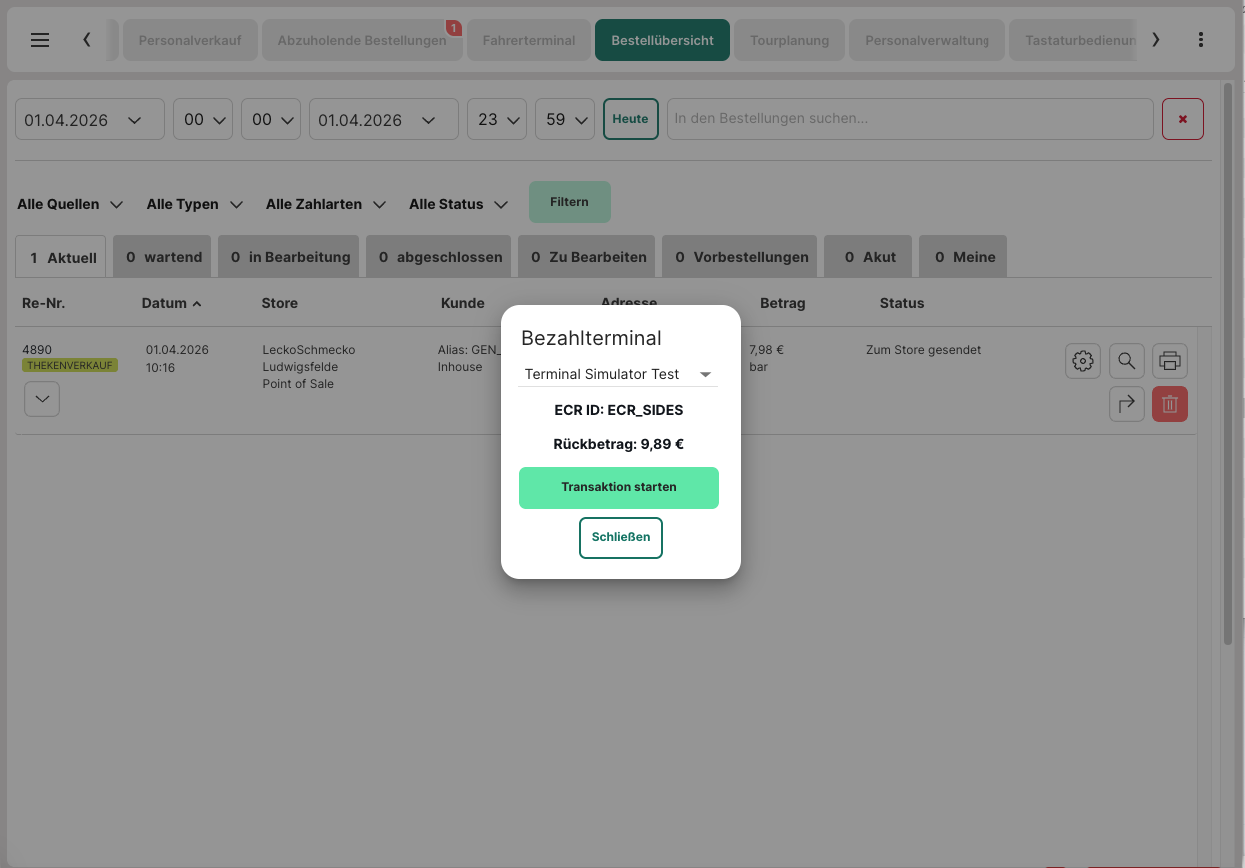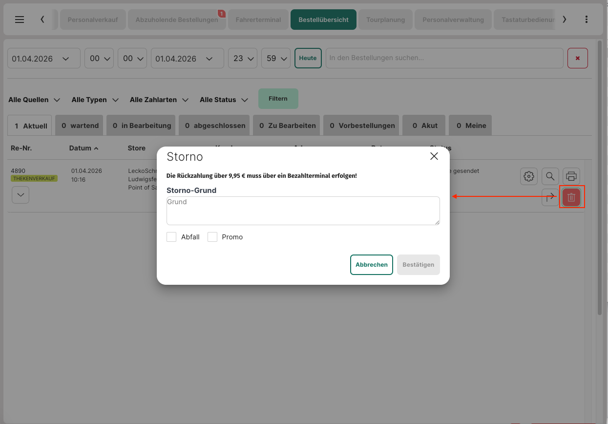 Das Stornieren der Bestellungen, die über ein EC-Terminal bezahlt wurden, kann über die Bestellliste erfolgen. Dies funktioniert nur über die "neue" Version der Bestellliste.