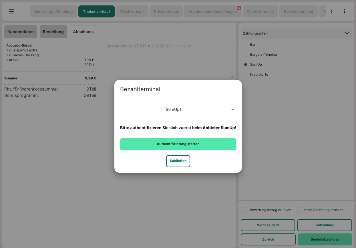 (Die Zahlungsart "EC-Terminal" (und somit unter Anderem SumUp) ist nur in der POS in der "KASSE" beim Thekenverkauf, beim Tischverkauf und beim Personalverkauf, sowie in der "MOBILE[-N] KASSE" verfügbar.)