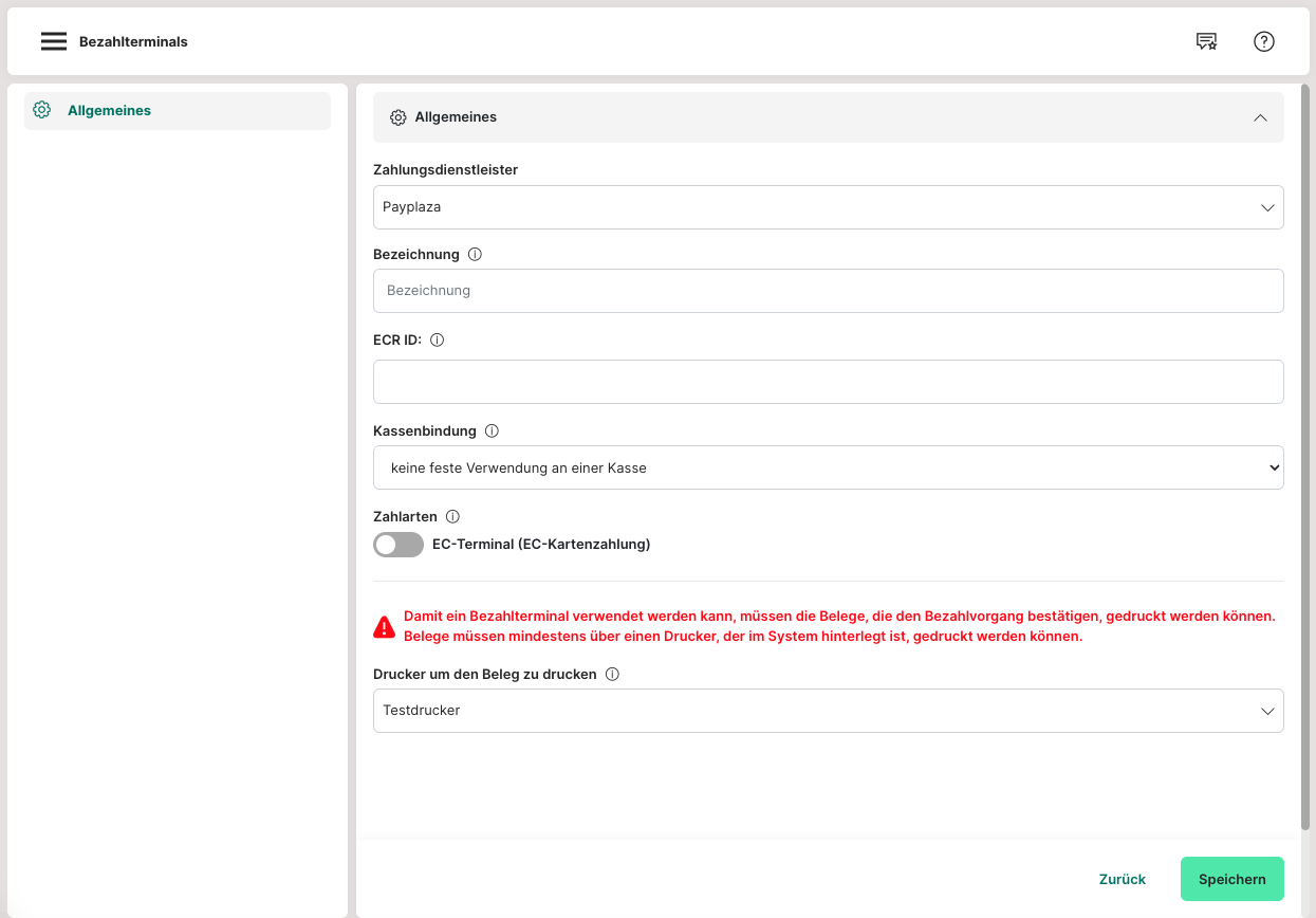 Unten wird erläutert, wie man Schnittstellen zu Bezahlterminals grundsätzlich in unserem System anlegt und verwendet. Als Beispiel wird Payplaza genommen.