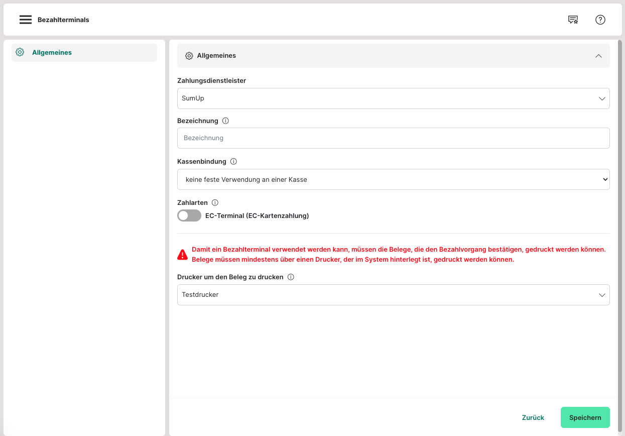 Bitte stelle sicher, dass die entsprechende Zahl(ungs)art "EC-Terminal" bzw. "EC-Terminal (Kartenzahlung)" für den Store aktiviert wurde. Sollte die Zahlart komplett fehlen, muss diese durch uns zuvor freigeschaltet werden.