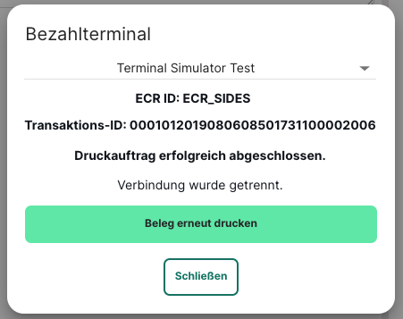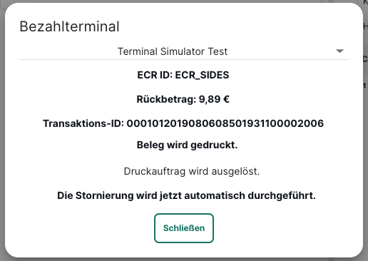 Wurde der Stornobeleg erfolgreich gedruckt, ist die Transaktion erfolgreich abgeschlossen und die Verbindung getrennt. Sollte der Kunde ebenfalls eine Kopie des Stornobelegs wünschen, kann hier erneut eine Kopie des Bons gedruckt werden.