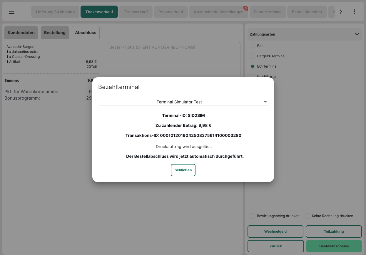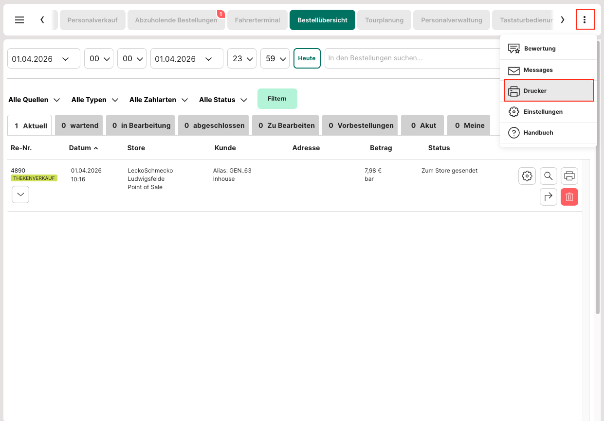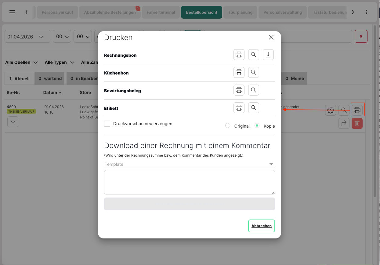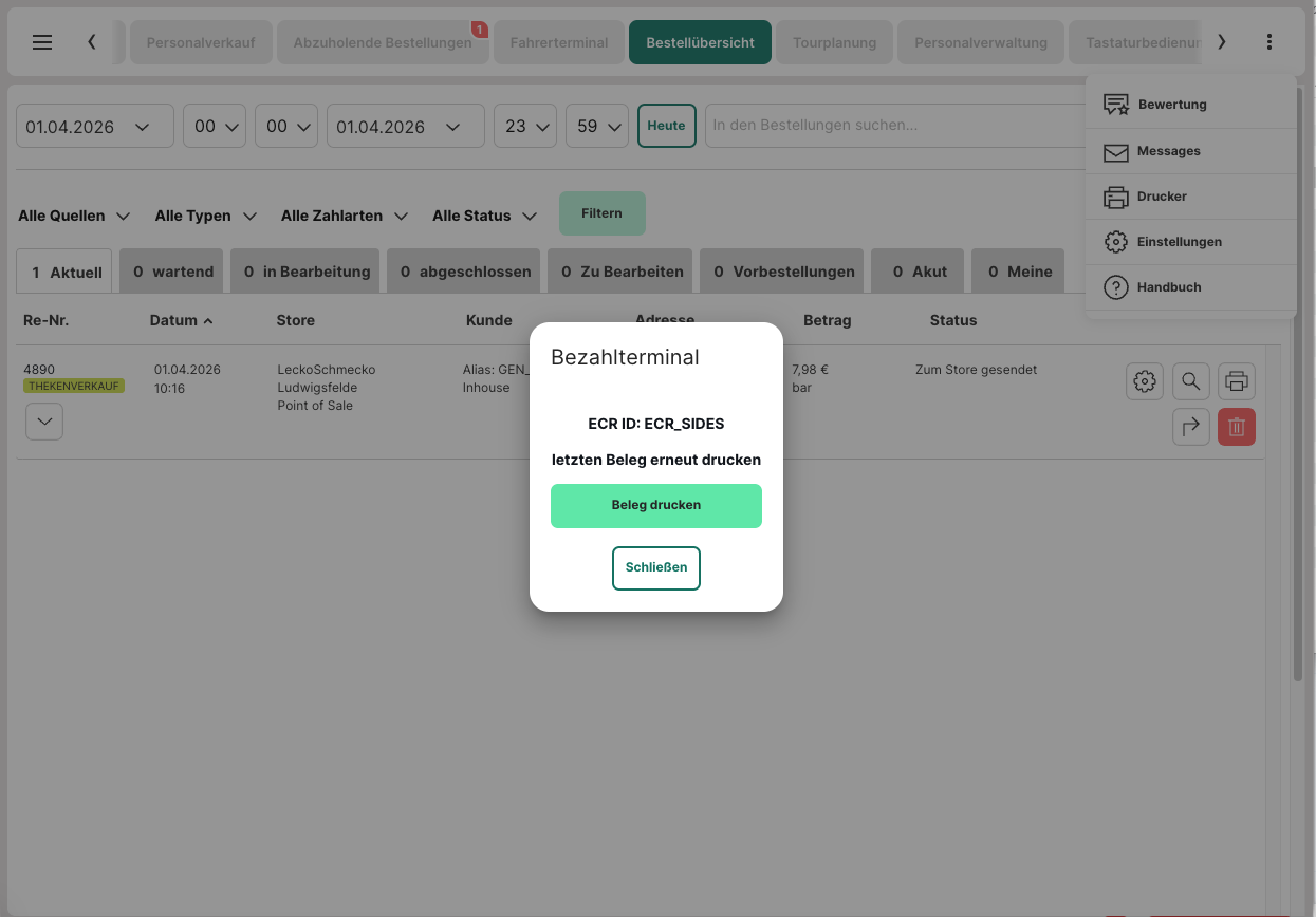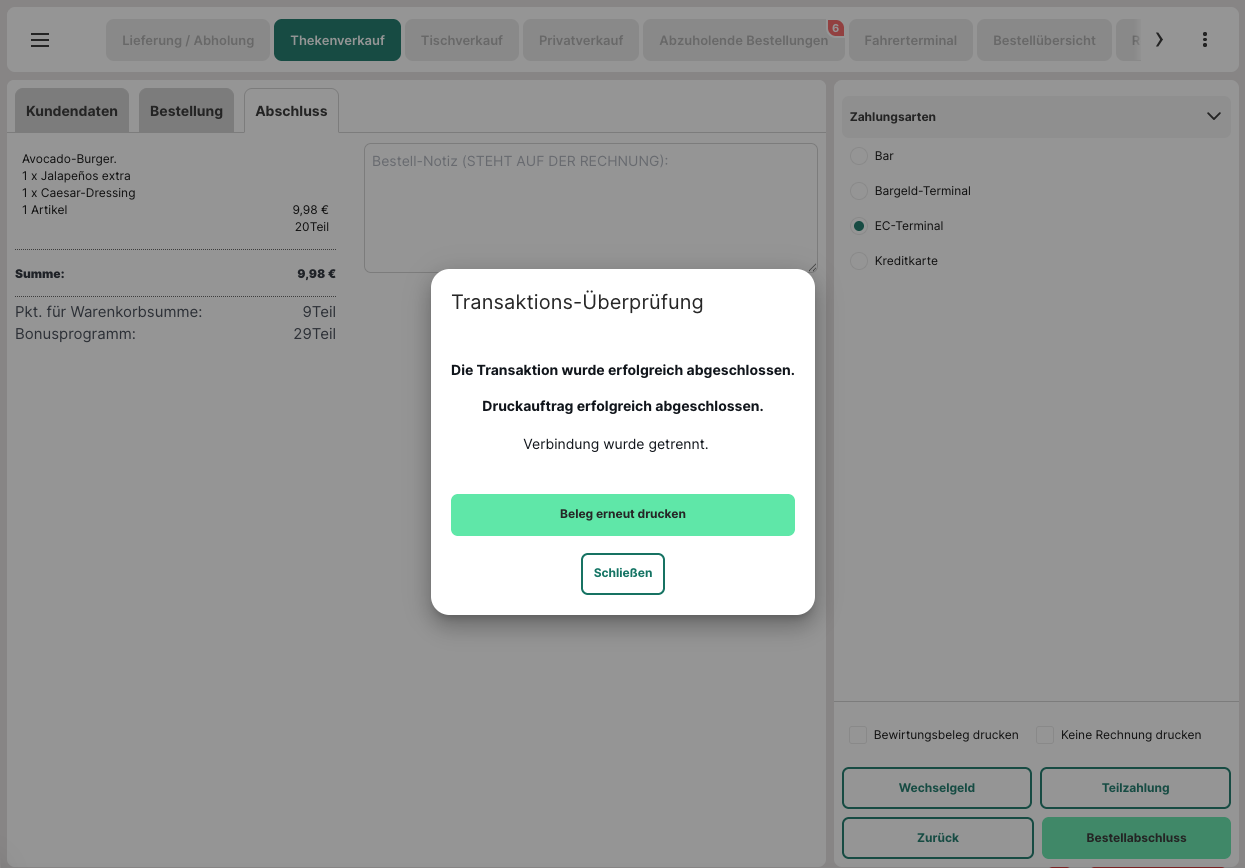 Willst du derzeit nicht erneut einen Beleg drucken, kannst du dies jederzeit über die Bestellansicht wiederholen.