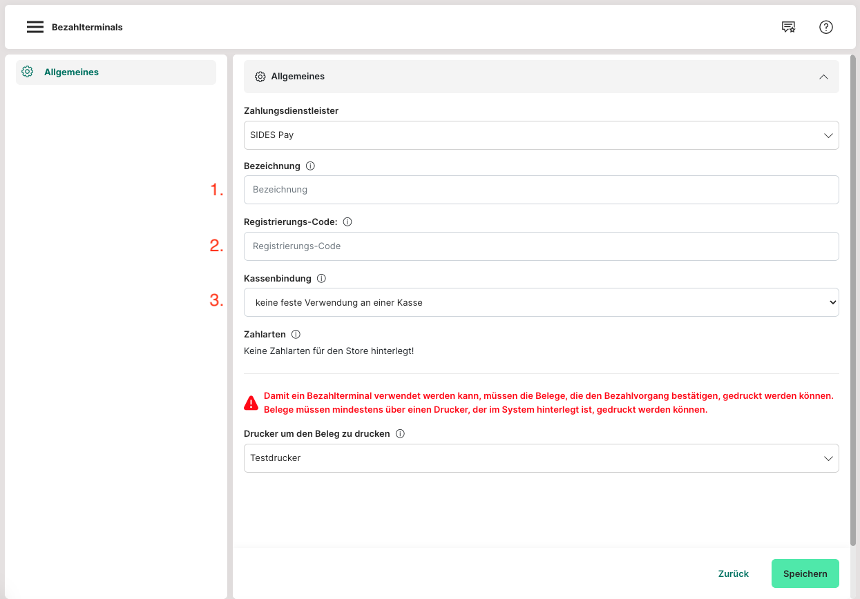 Sobald die Migration des Terminals seitens Payplaza abgeschlossen ist, kannst du das Terminal in der Kasse verwenden. Bis dahin sollten folgende Einstellungen im System von SIDES getroffen werden.